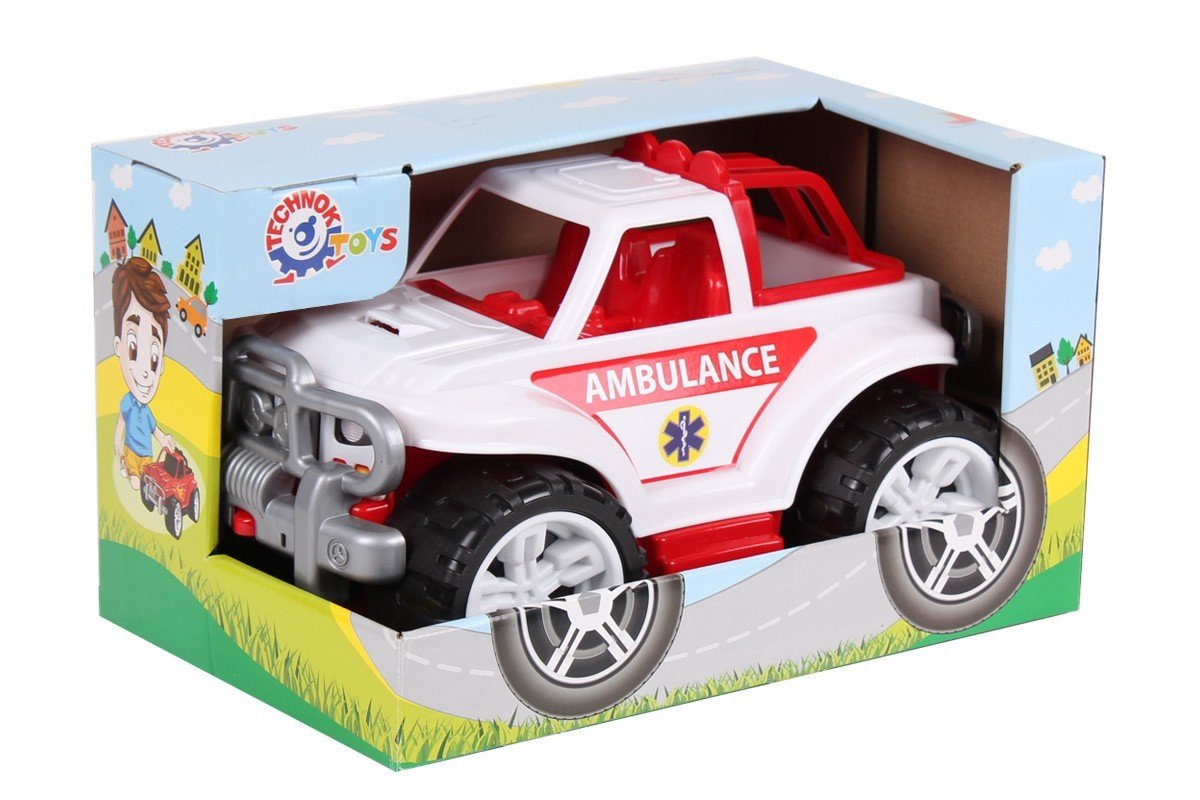 Машинка "Швидка ТехноК". Позашляховик з відкритим кузовом, масивними бамперами і великими колесами. Оптимальні розміри для використання як в кімнаті так і для гри на вулиці.