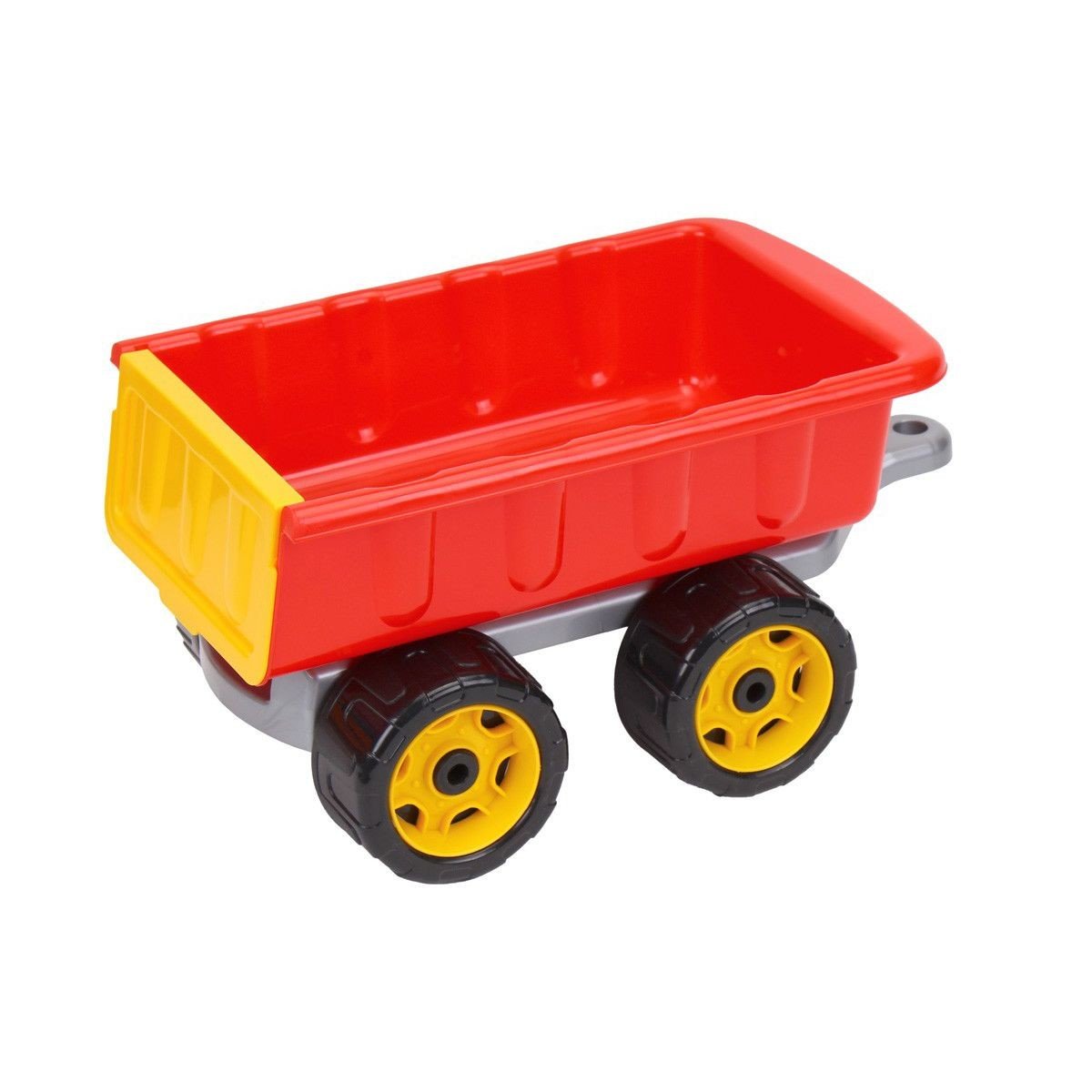 Місткий причіп на 4 колесах. Є петелька, за яку можна прикріпити його до машинки. Розмір: 31х16х19 см.