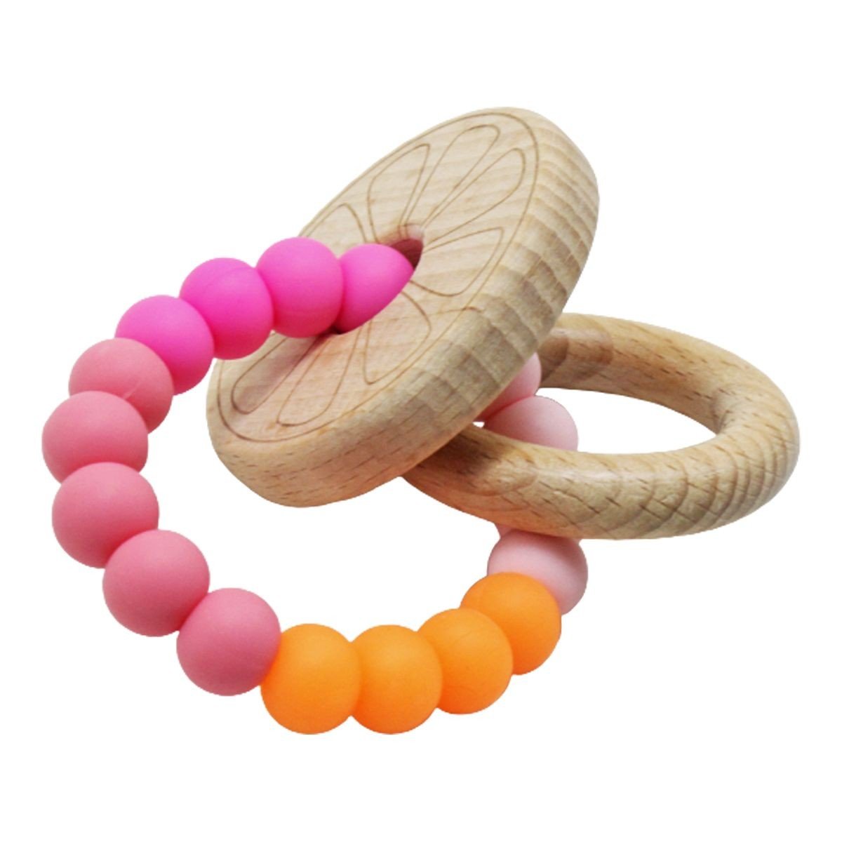 Прорізувач силіконовий абсолютно безпечний для малюка. Виконаний у вигляді браслетика з гумовими намистинами та дерев'яними кільцями, що гримлять. Дитина зможе самостійно тримати іграшку навіть однією рукою. Допоможе зняти дискомфорт під час прорізування зубів. Сприяє концентрації уваги, розвиває дрібну моторику, тактильні відчуття, координацію рухів та сприйняття кольорів.