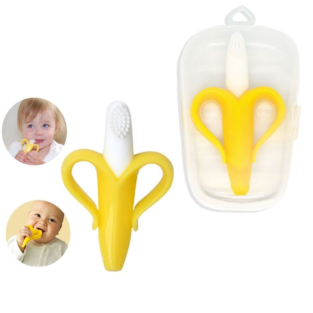 Прорізувач для зубів у вигляді банана. Стилізований під зубну щітку з м'якими силіконовими щетинками. Має зручні для дитячої долоньки ручки. М'яко масажує ясна малюка, полегшує дискомфортні явища в період прорізування зубів. Виготовлений з безпечного силікону.