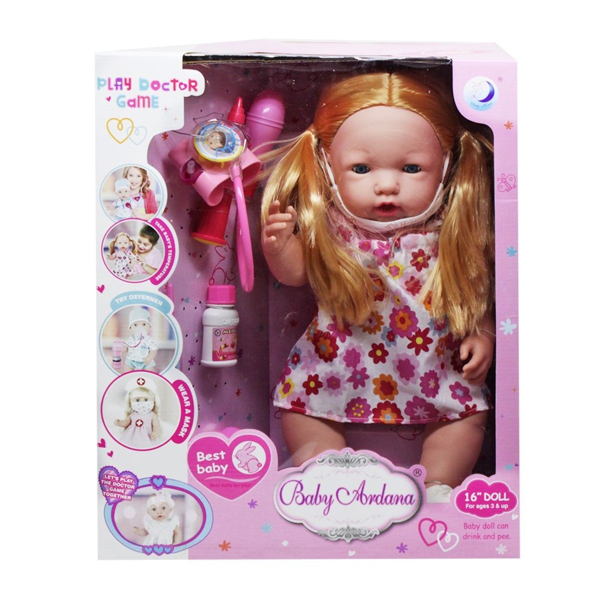 Мила лялька пупс із набором лікаря стане чудовим подарунком дитині. У комплекті є: лялька в масці та милому сукні, мило, тонометр, таблетки, шприц, краплі в очі. Незвичайна лялька може пити воду та писати. Висота іграшки 40 см. Виконана з якісних та безпечних матеріалів. Для дітей віком від 3-х років.