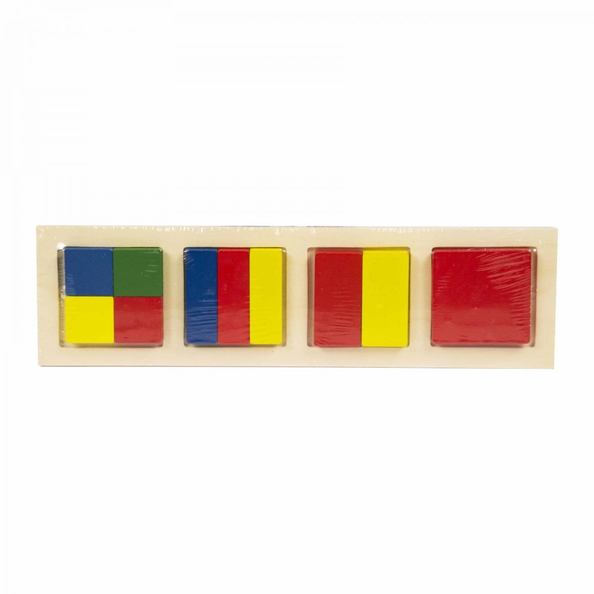 Рамка-вкладиш складається з дошки-основи, спеціальних отворів і геометричних фігур. Завдання дитини скласти з деталей квадрат, який буде включати в себе 1,2,3 і 4 частини.