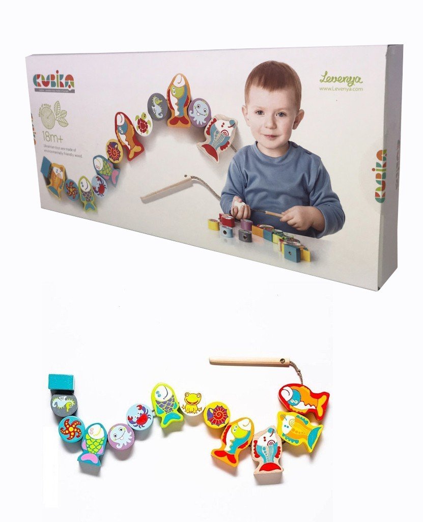 Рибки -сілянкі. Розвиваюча дитяча гра, виготовлена з екологічно чистої деревини. У наборі: 12 деревяних елементів (рибки і інші морські мешканці) зі спеціальними отворами, через які необхідно нанизувати елементи на шнурок.