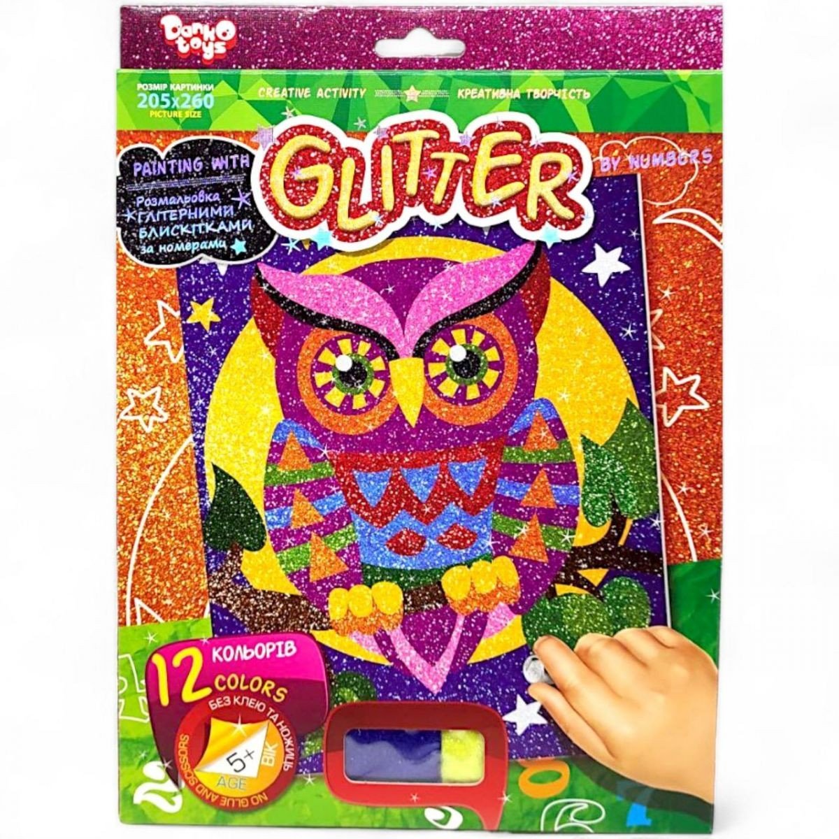 Набір для творчості "Розмальовка глітером". Набір розвиває фантазію, художній смак і преобщает до мистецтва. На заготівлі нанесені цифри, які відповідають кольорам пакетиків з блискітками. Відокремлюючи захисний шар певного кольору засипте його глітером. 12 кольорів.