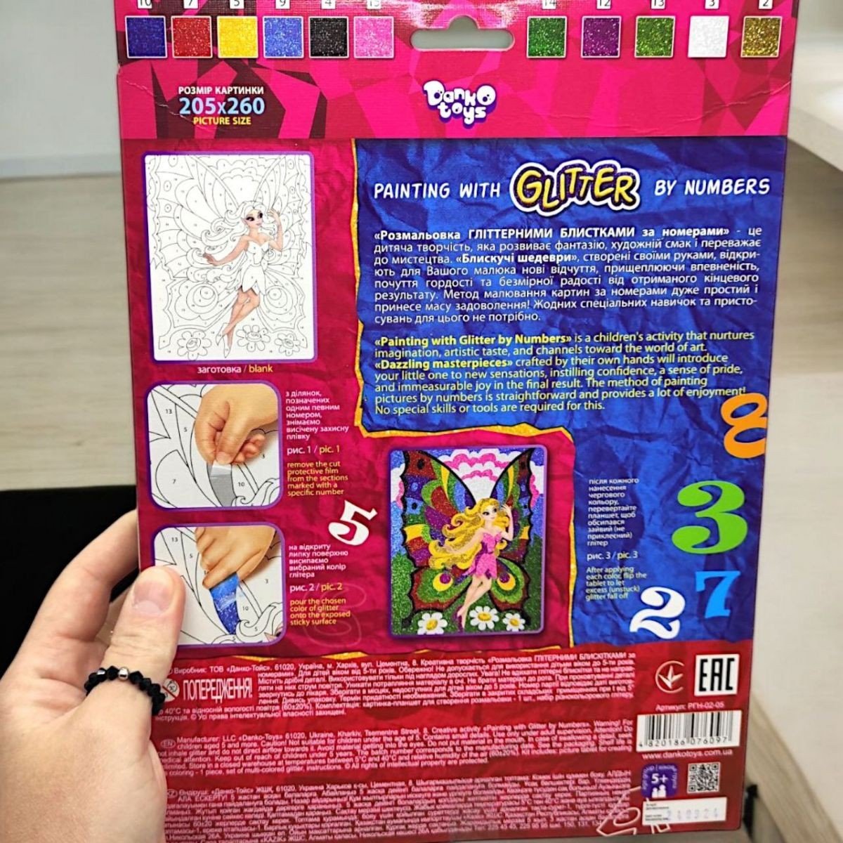 Бренд: Dankotoys Упаковка: Коробка Колір: Різнобарв'я Вага з упаковкою: 140 г Габарити в упаковці: 21 x 1.5 x 30 см Габарити без упаковки: 21 x 2 x 30 см Країна виробник: Україна Матеріал: Комбінований Комплектація: Картина-планшет, гліттер, інструкція