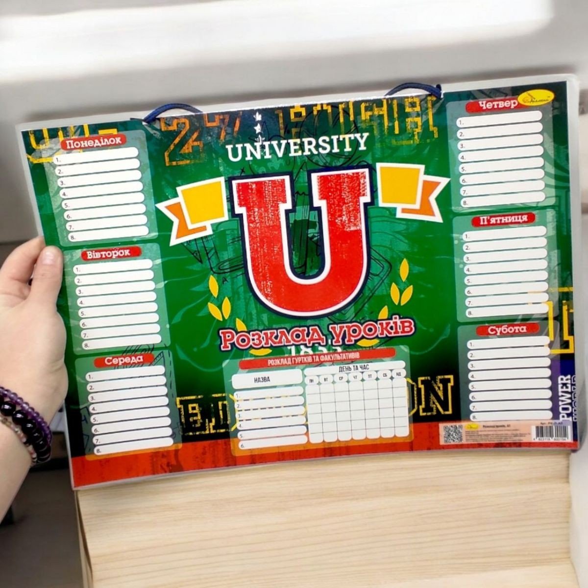 Барвистий бланк для розкладу уроків багаторазового використання. Розрахований на 6 днів (понеділок – субота). Щодня можна записати максимум 8 уроків. Бланк заламінований, що робить його стійким до зовнішніх пошкоджень, а також дозволяє писати на ньому маркером (на водній основі) та зтирати написане. До бланку прикріплений шнурочок для кріплення. Формат А3.