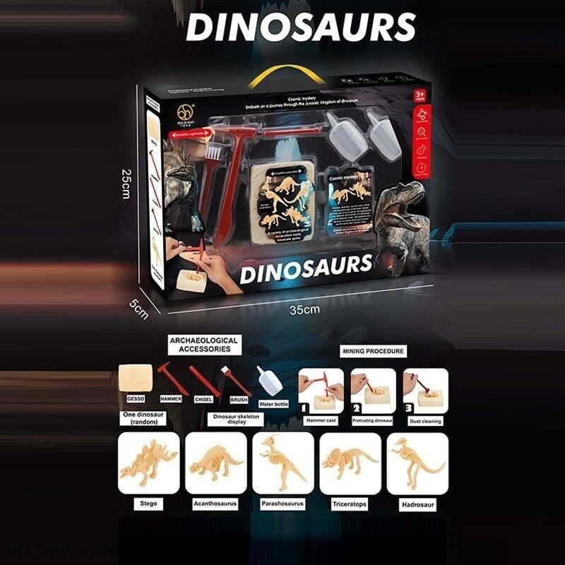 Відчуйте себе справжнім відважним археологом та вирушайте на пошуки стародавніх скарбів!Цей набір познайомить допитливу малечу із такою цікавою наукою як археологія. До набору включено гіпсовий брикет, у якому ховаються “скарби” - цікаві тематичні дрібниці, які дитині потрібно відшукати за допомогою інструментів, які теж включені до набору. Аби трохи полегшити задачу й позбутися пилу, брикет можна змочити водичкою. До набору включено інструменти для проведення розкопок, “скарби” набору ховаються у гіпсовому брикету. Для полегшення роботи із брикетом можна змочити його у воді.