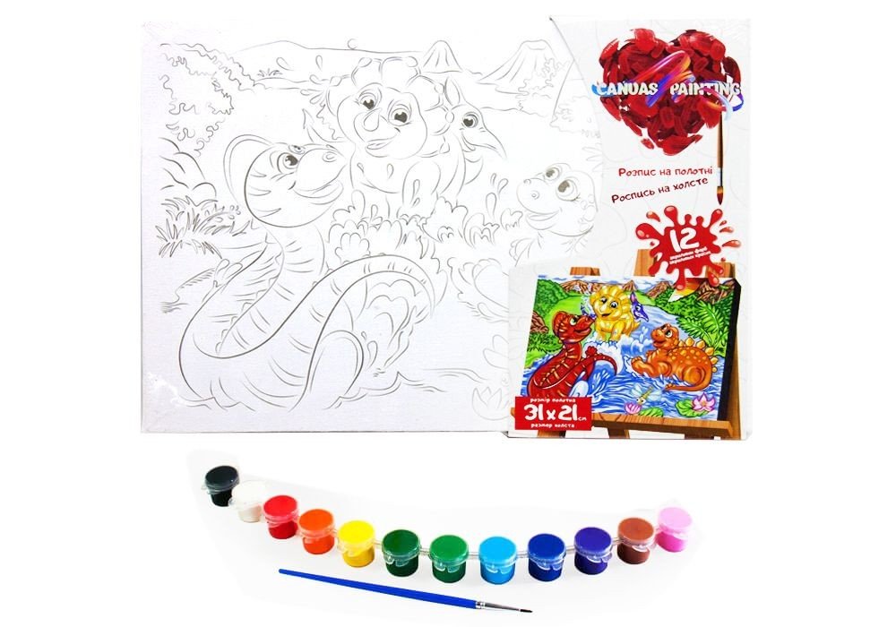 Розфарбування на полотні. Унікальний метод розфарбовування "контурних картин" фарбами. У наборі, крім полотна, на підрамнику є ще й паперовий, тренувальний контур. 12 фарб і пензлик в комплекті.