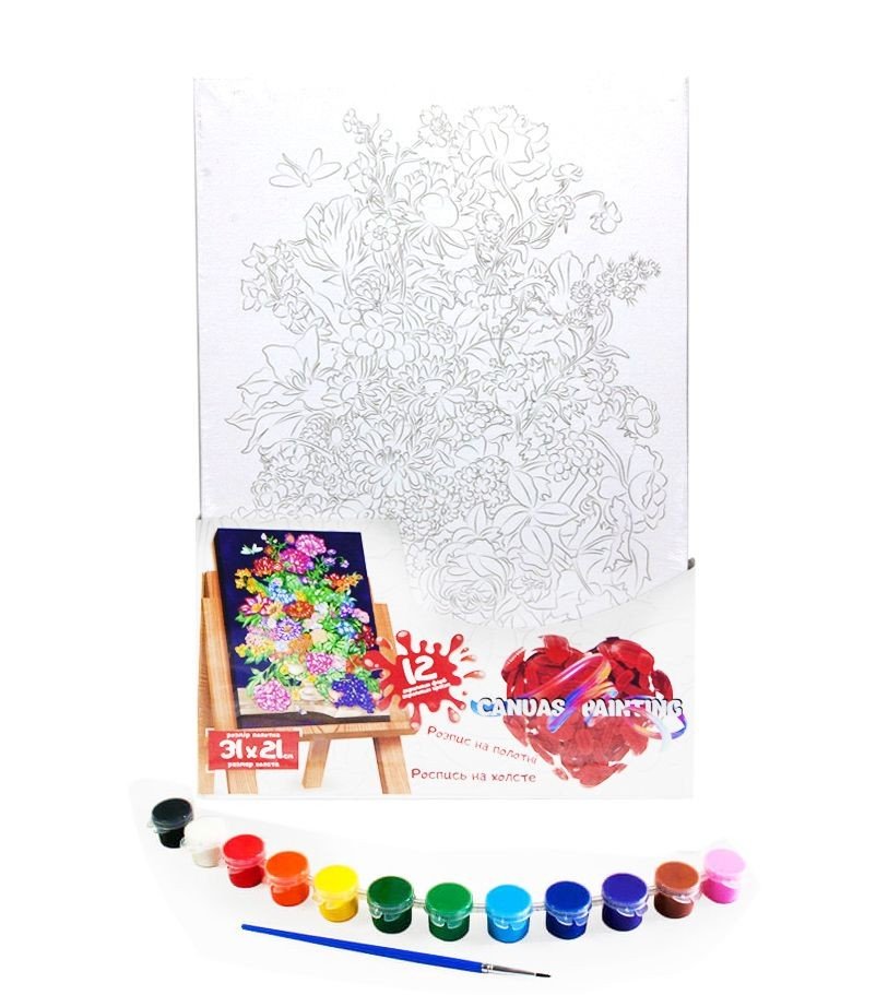 Розфарбування на полотні. Унікальний метод розфарбовування "контурних картин" фарбами. У наборі, крім полотна, на підрамнику є ще й паперовий, тренувальний контур. 12 фарб і пензлик в комплекті.