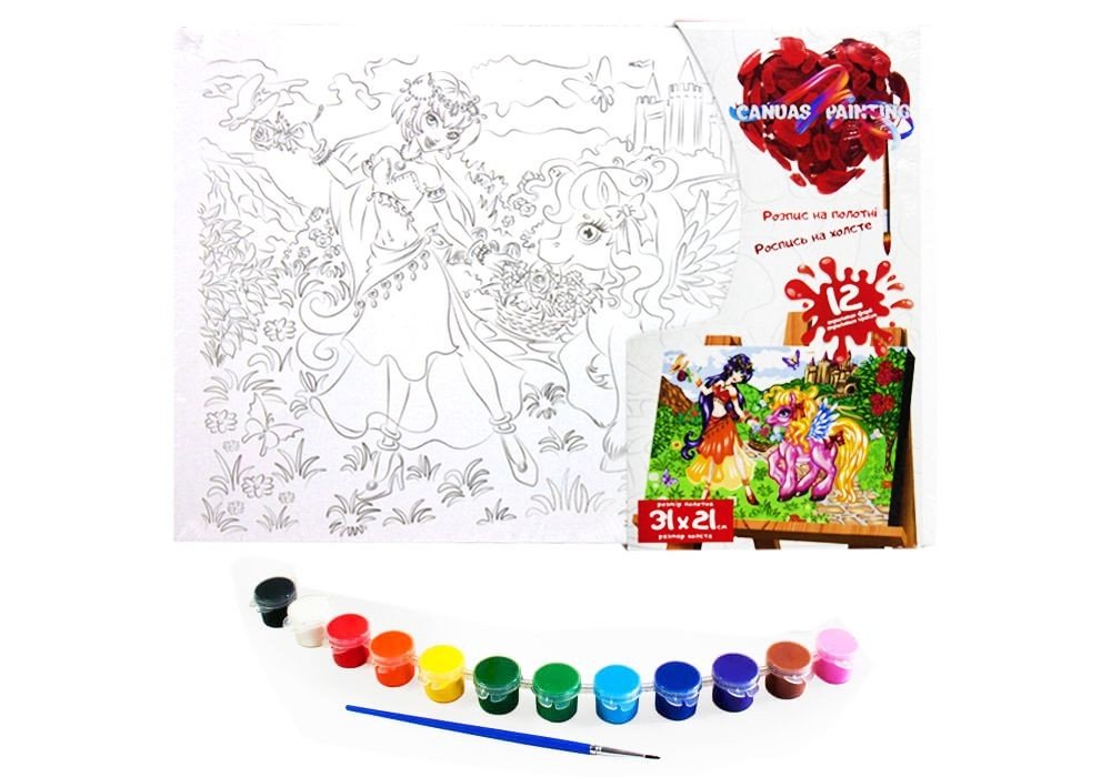 Розфарбування на полотні. Унікальний метод розфарбовування "контурних картин" фарбами. У наборі, крім полотна, на підрамнику є ще й паперовий, тренувальний контур. 12 фарб і пензлик в комплекті.