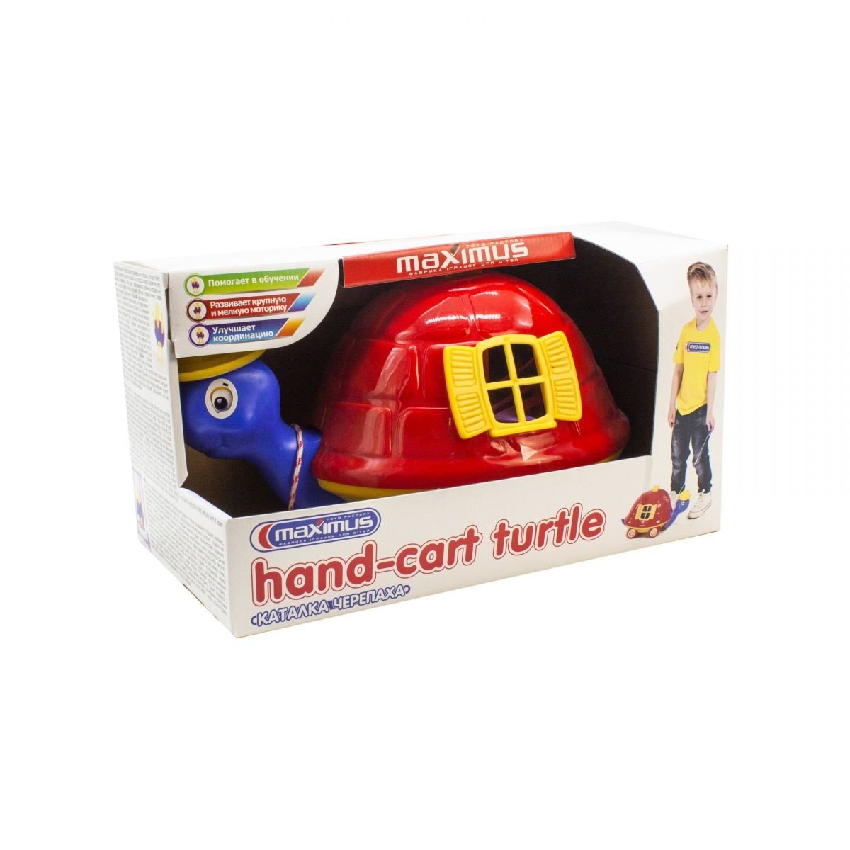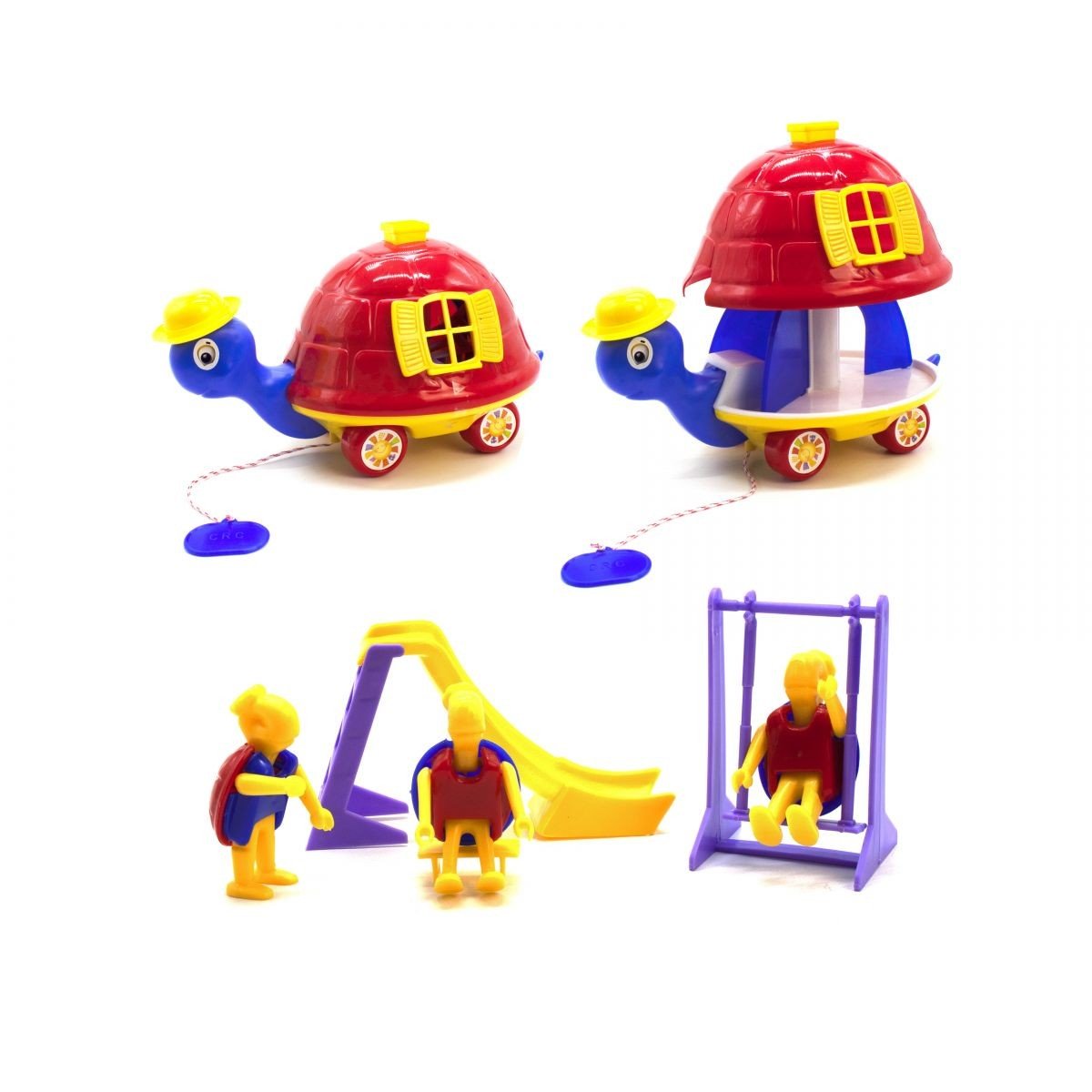 Яскрава каталка у вигляді черепашки, у якої всередині панцира знаходиться будиночок. Якщо натиснути черепашке на хвостик - будиночок підстрибне вгору, і всередині виявиться майданчик з іграшками. У комплекті: 3 фігурки черепашок (7 х 4 см) з рухомими ручками, ніжками і головою, табуретка, гірка і гойдалка. При русі черепаха на колесах хитає головою. Возити каталку можна за зручну мотузочку з ручкою.