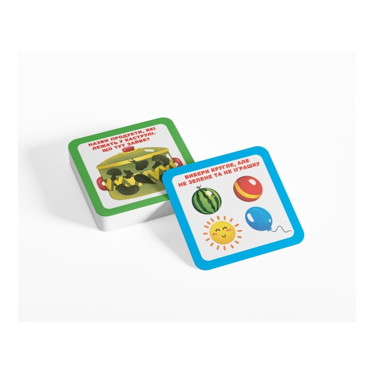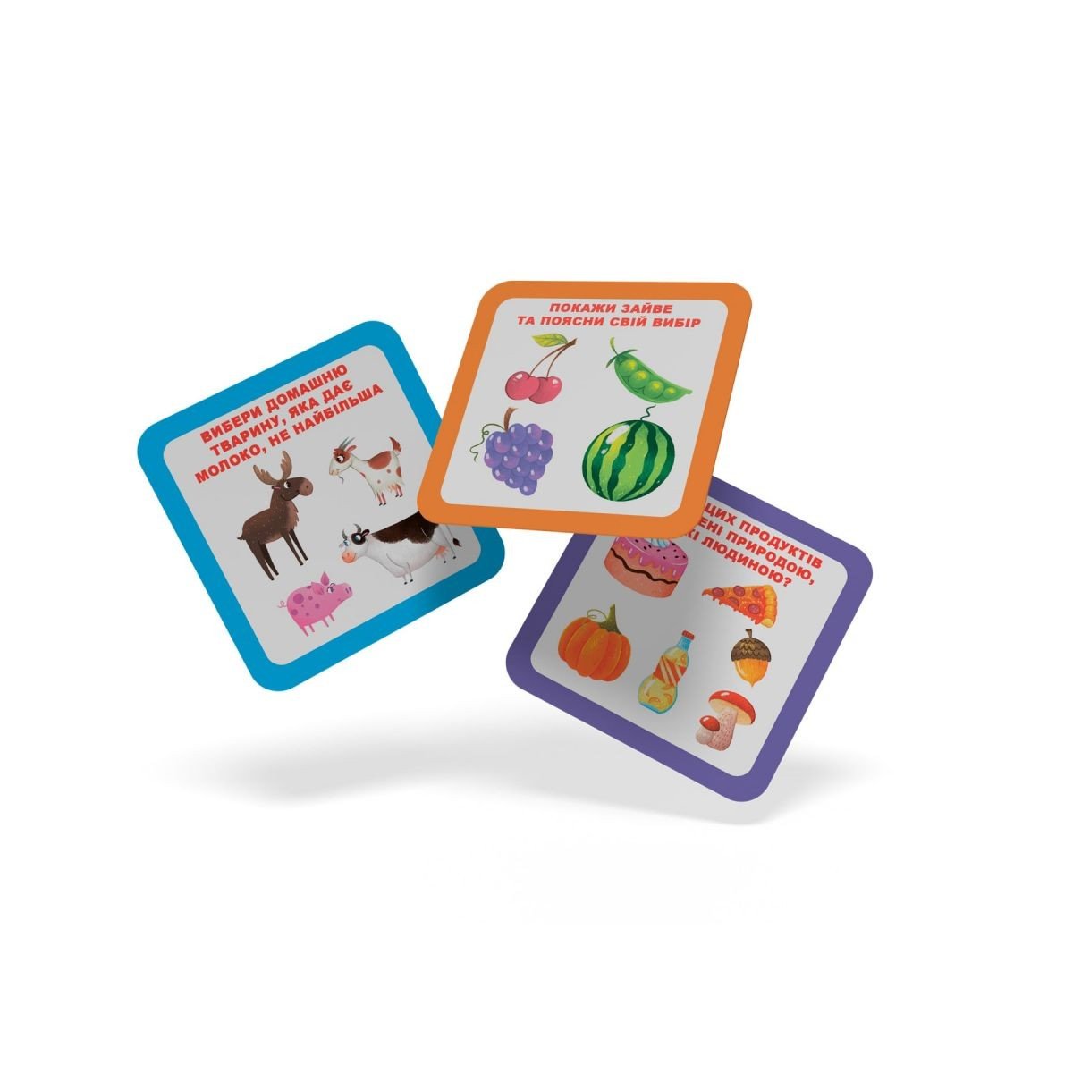 Набір розумних карток, які допоможуть малюкові дізнаватися малюкові нову інформацію за допомогою гри. Навчання в ігровій формі допоможе дитині краще запамʼятовувати інформацію а проговорювання дій, вести діалоги та створювати ігрові сюжети під час занять допоможе покращити мовлення.. Набір включає 30 двосторонніх карток (60 зображень), розміром 98х98 мм.