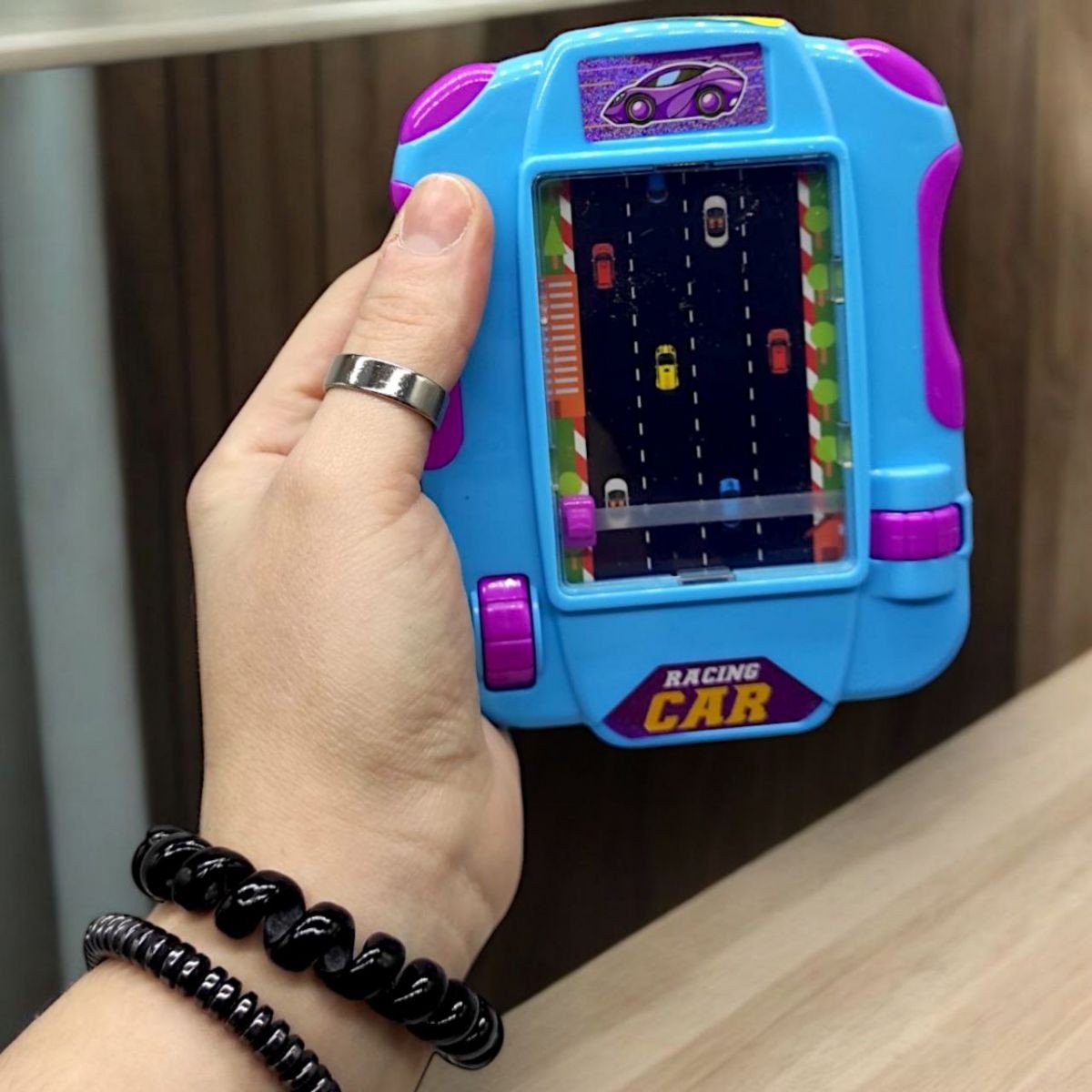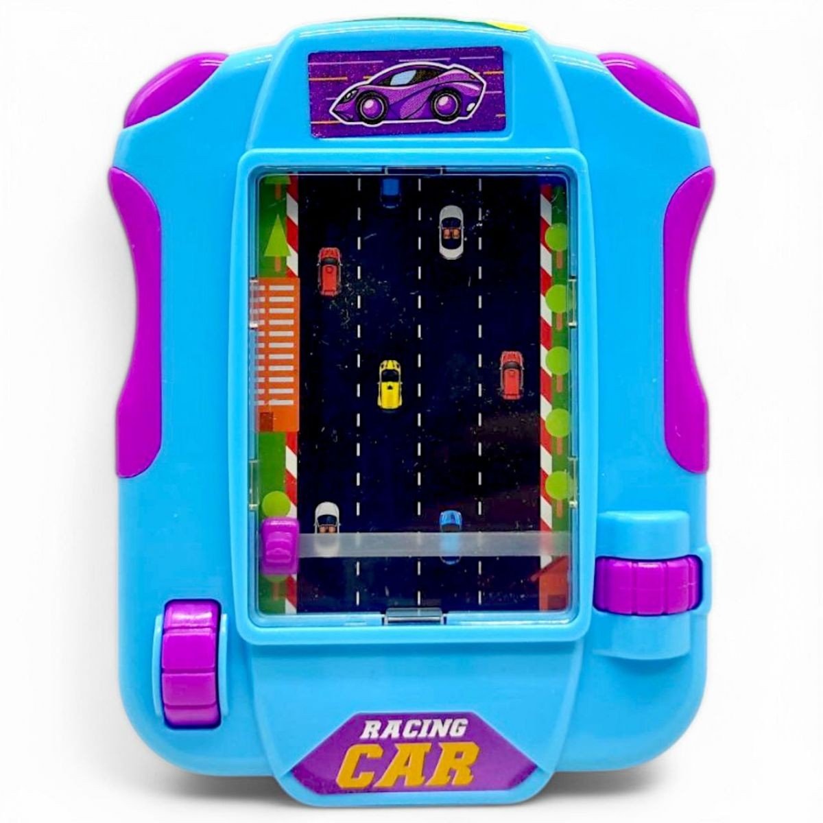 Розважальна гра "Тільки вперед". В процесі гри дитина буде керувати автомобілем, який їде по заповненій трасі. Змініючи полоси і оминаючі інші машини, дитина розвиватиме дрібну моторику і реакцію. Керування здійснюється за допомогою колес збоку екрану іграшки - одне колесо відповідє за рух вперед і назад, інше за рух ліворуч та праворуч. Іграшка механічна і не потребує батарейок.