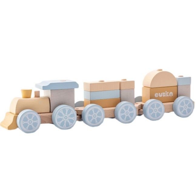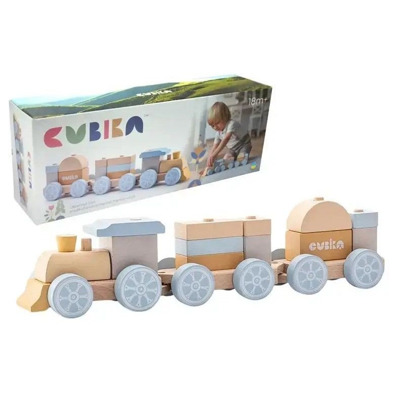 Іграшка складається з локомотива та кількох вагонів, на яких розміщуються дерев’яні блоки різної форми. Дитина може комбінувати елементи, створювати власні варіанти складання та перевозити “вантаж” за допомогою потяга.