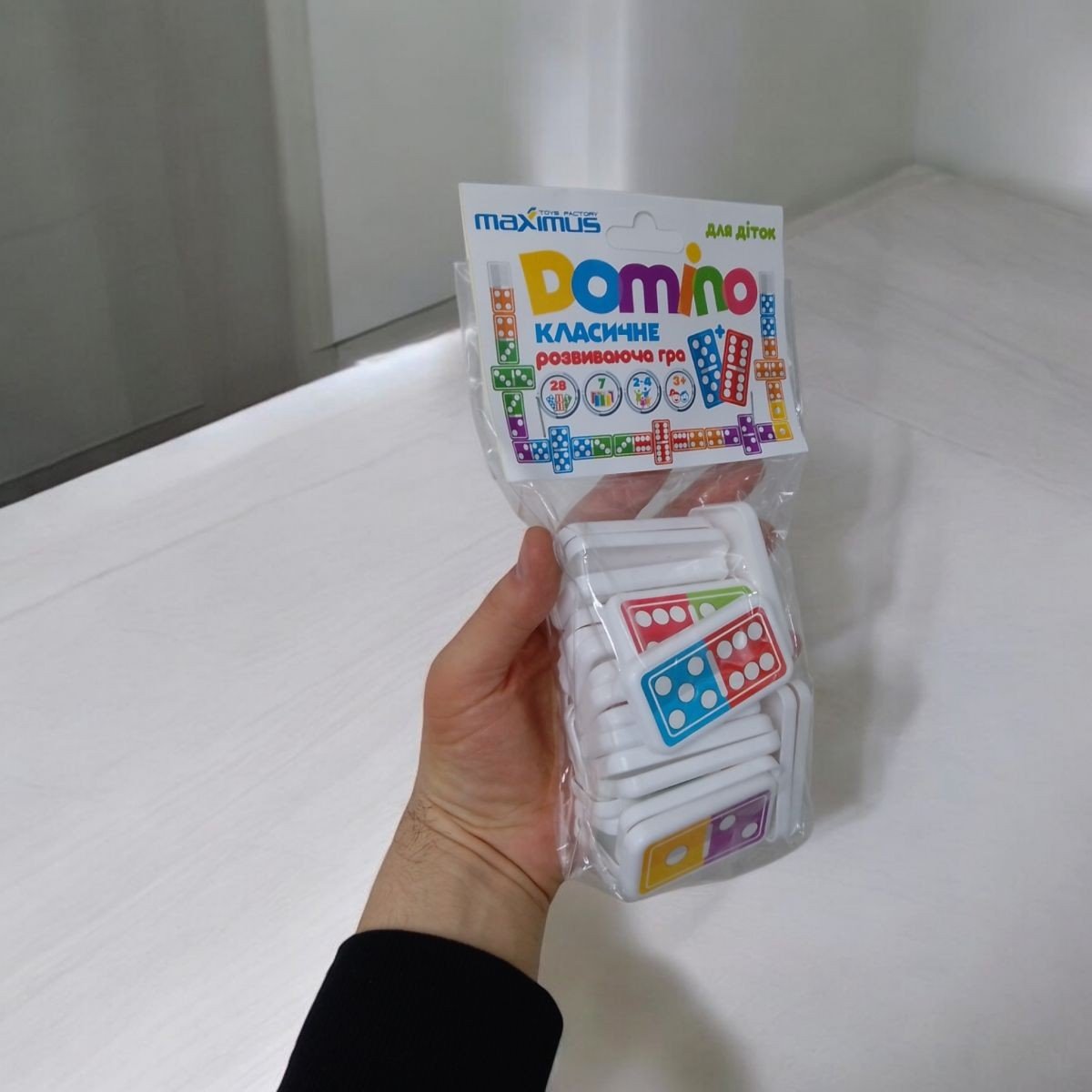 Класична настільна гра "Доміно", виконана в безпечному та яскравому дизайні, що робить її ідеальною для гри з дітьми. Доміно — настільна гра, в процесі якої вишиковується ланцюг кісточок («кісток», «каменів»), що стикаються з половинками з однаковою кількістю точок, що позначає число очок. У наборі 28 кістячок.