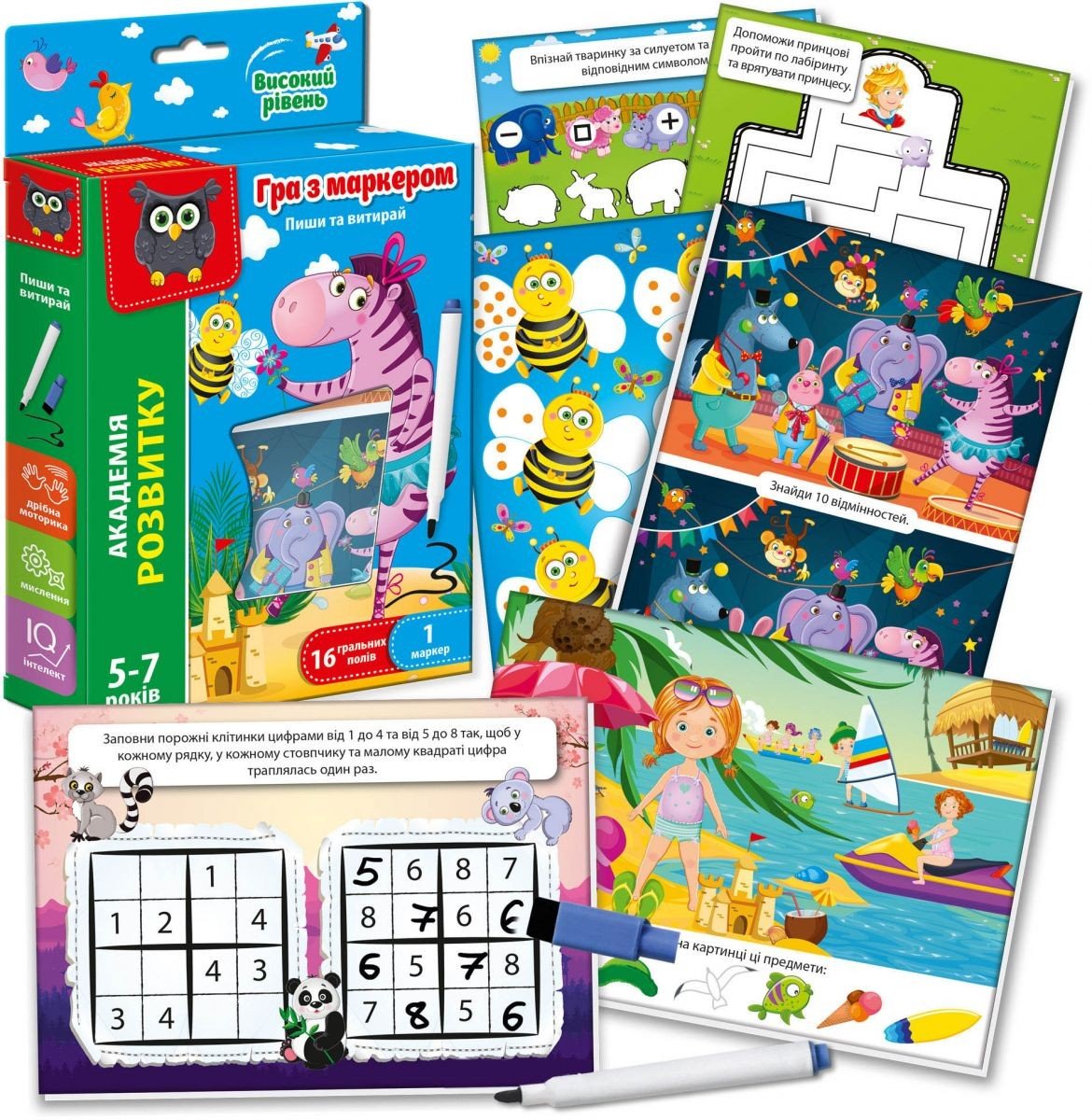 Розвиваюча гра "Пиши і витирай" складається з 16-ти карток (16 х 11 см) з різними завданнями і маркера з губкою, яким можна писати на картках, а потім прати і писати заново. Розвиває інтелект, мислення і дрібну моторику. Рівень: просунутий.