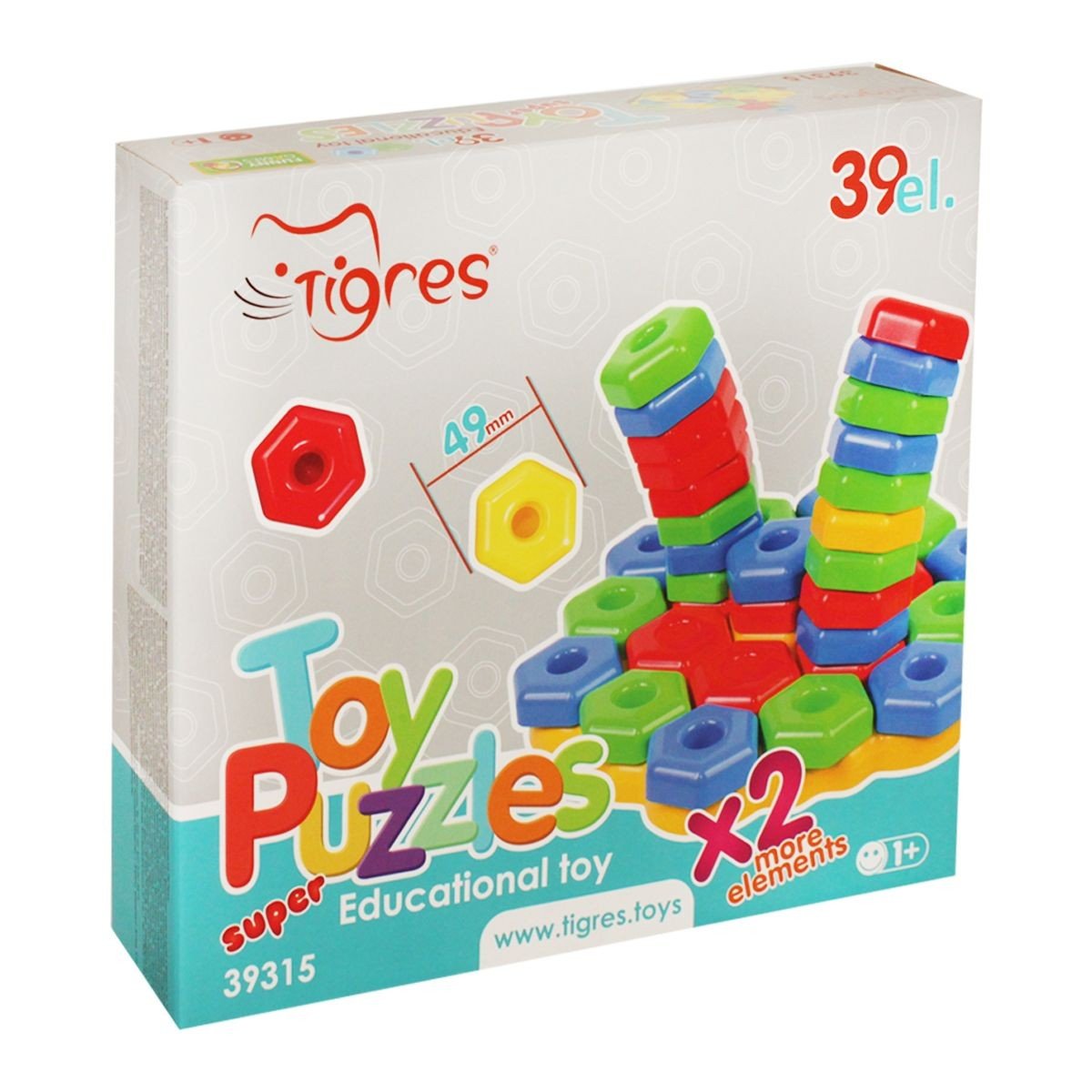 Ігро-Пазли, 39 елементів. Одягаючи елементи на основу, можна створювати цікаві конструкції: квіточки, тортики, сніжинки, башточки, літачки і багато іншого. Гра з Игро-Пазлами корисна для розвитку просторового мислення, інтелекту і уваги, моторики, координації і спритності рухів. Виготовлена з якісних матеріалів. Розмір фішки: 3.8 x 5.8 см. Діaмeтp ocнoви: 14 cм.