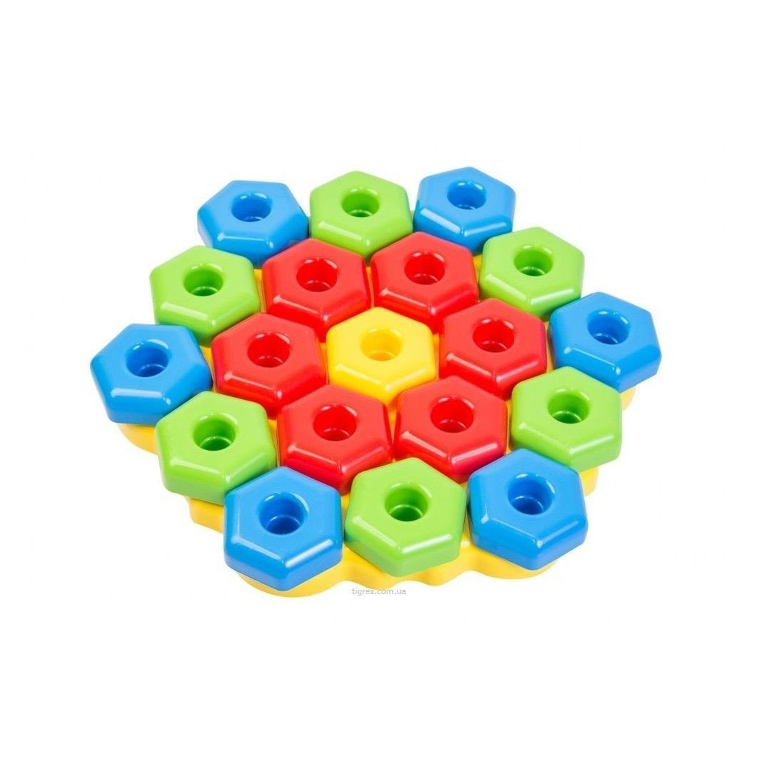 Ігро-Пазли, 20 елементів. Одягаючи елементи на основу, можна створювати цікаві конструкції: квіточки, тортики, сніжинки, башточки, літачки і багато іншого. Гра з Игро-Пазлами корисна для розвитку просторового мислення, інтелекту і уваги, моторики, координації і спритності рухів. Виготовлена з якісних матеріалів. Розмір фішки: 3.8 x 5.8 см. Діaмeтp ocнoви: 14 cм.
