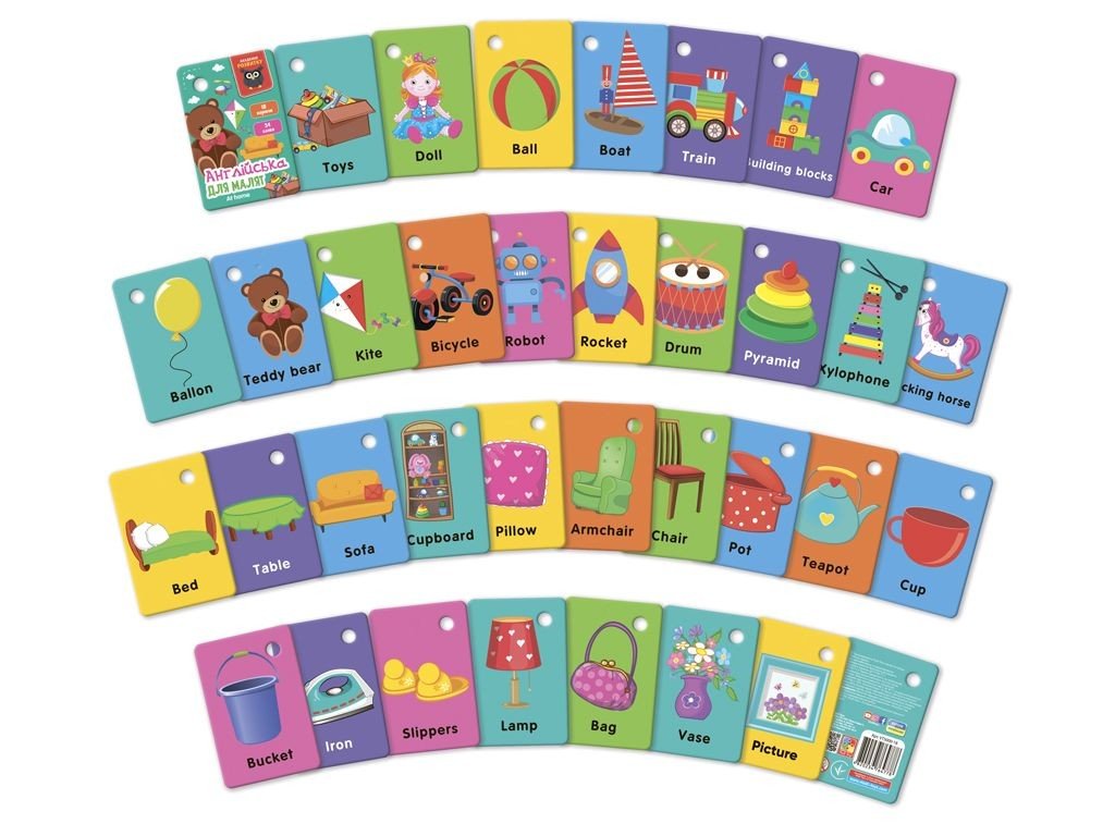 Вивчайте разом із малюком англійські слова та розглядайте яскраві ілюстрації до них. Виконуйте разом цікаві завдання. Набір складається з 18 двосторонніх карток на пластиковому кільці, яке можна прикріпити до ліжечка або коляски, або просто тримати в руці.