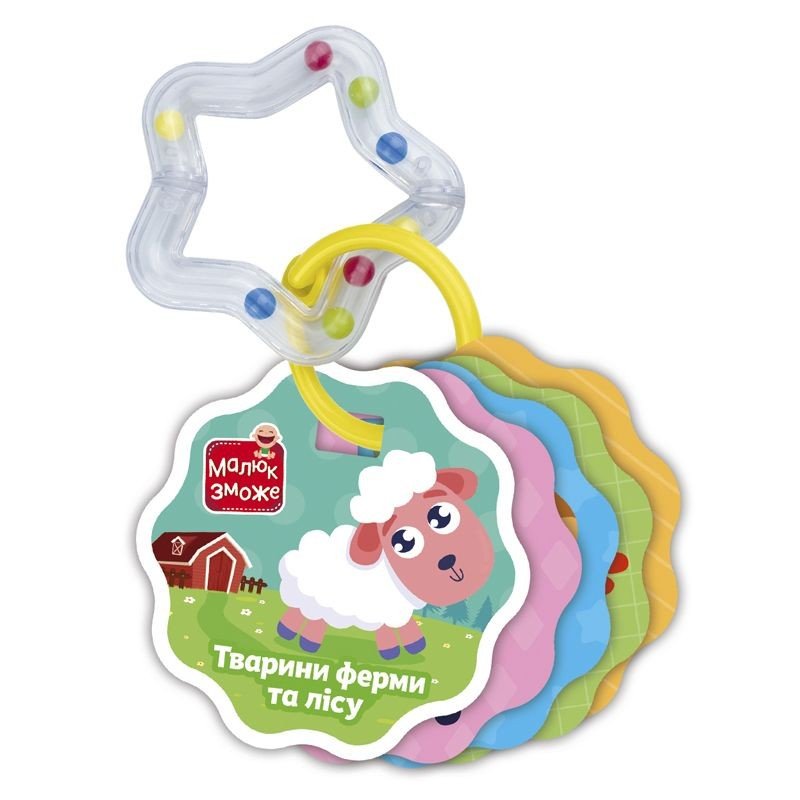 Іграшка-набір, що складається з 6-ти карток з яскравими картинками та прозорого брязкальця, всередині якого видно різнокольорові кульки. Картки та брязкальце скріплені кільцем, яке можна зняти або прикріпити картки до коляски або ліжечка за його допомогою. Граючи з картками, дитина зможе тренувати логічне мислення, дрібну моторику рук, памʼять та уяву. Виконані із міцного картону.