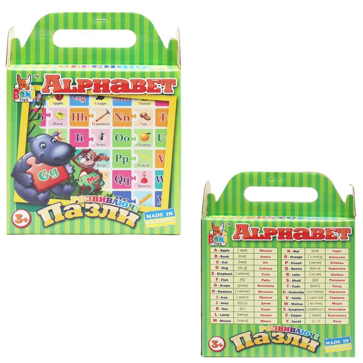 Ігровий набір - пазли, що розвівають, "Англійський алфавіт". Комплект складається із 60 пазлів. Гра полягає в тому, щоб кожній картці з літерами підібрати пару з відповідним малюнком. Гра розвиває дрібну моторику рук, пам'ять, увагу та навички спілкування. Для дітей віком від 3-х років.