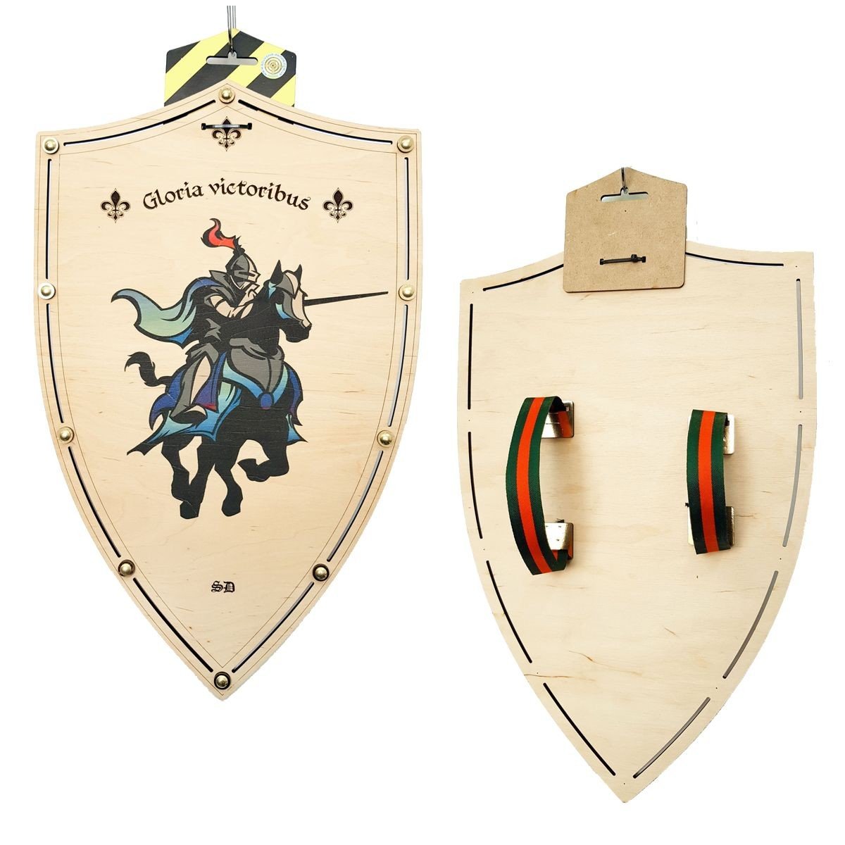 Модель щита з фанери (товщина 6 мм.). Лицьова сторона прикрашена зображенням; є декоративні елементи на корпусі; 2 ручки на зворотному боці щита. Розмір 47х30 см.
