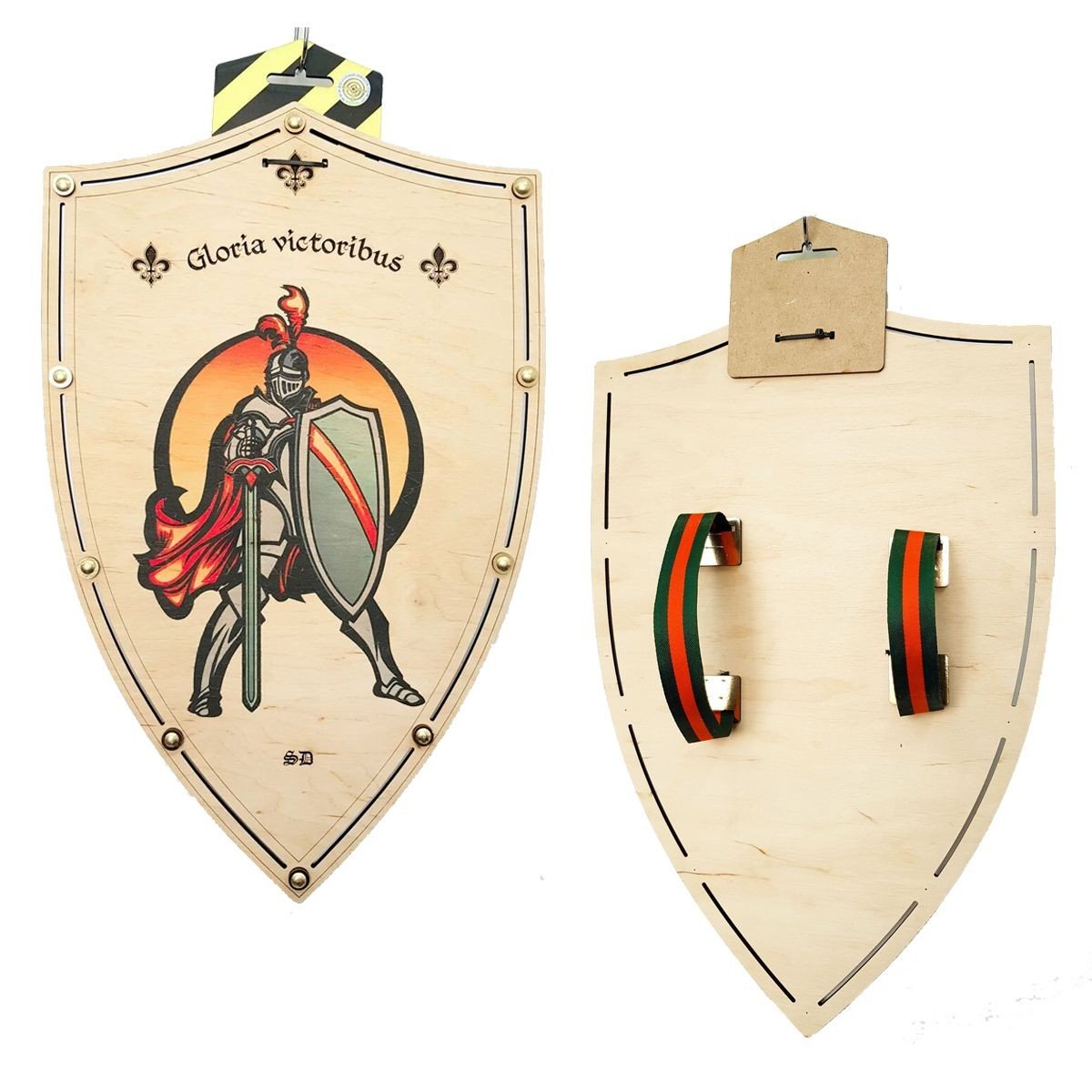 Модель щита з фанери (товщина 6 мм.). Лицьова сторона прикрашена зображенням; є декоративні елементи на корпусі; 2 ручки на зворотному боці щита. Розмір 47х30 см.