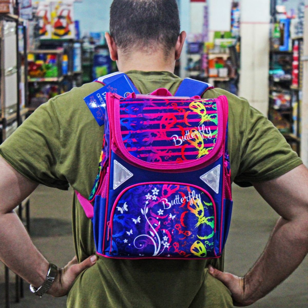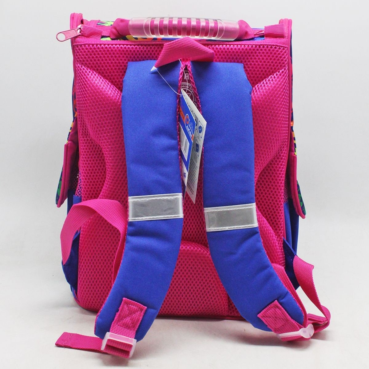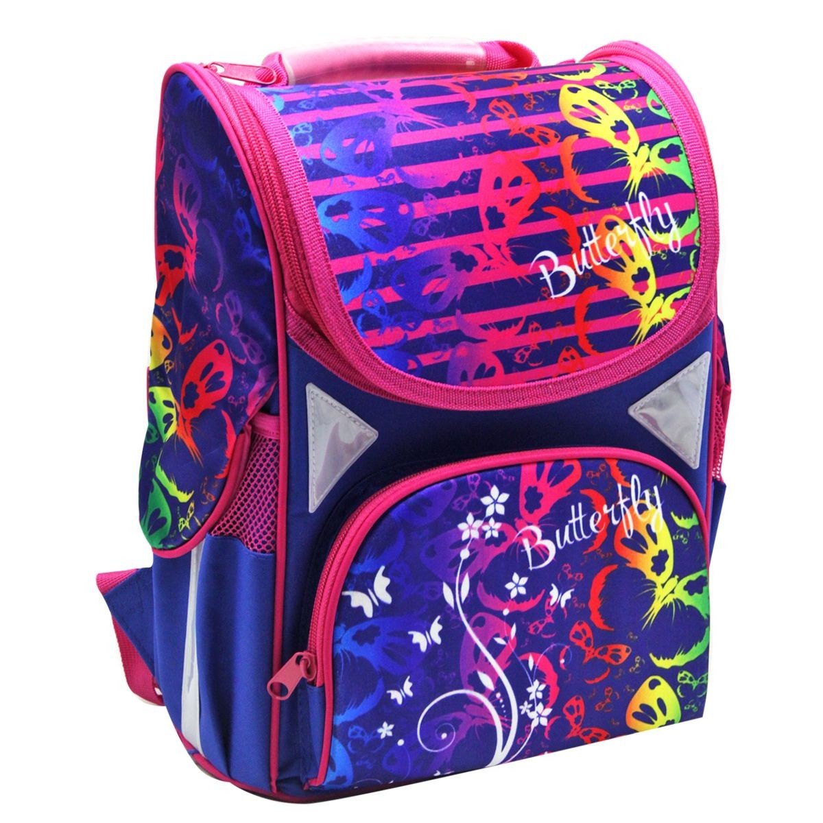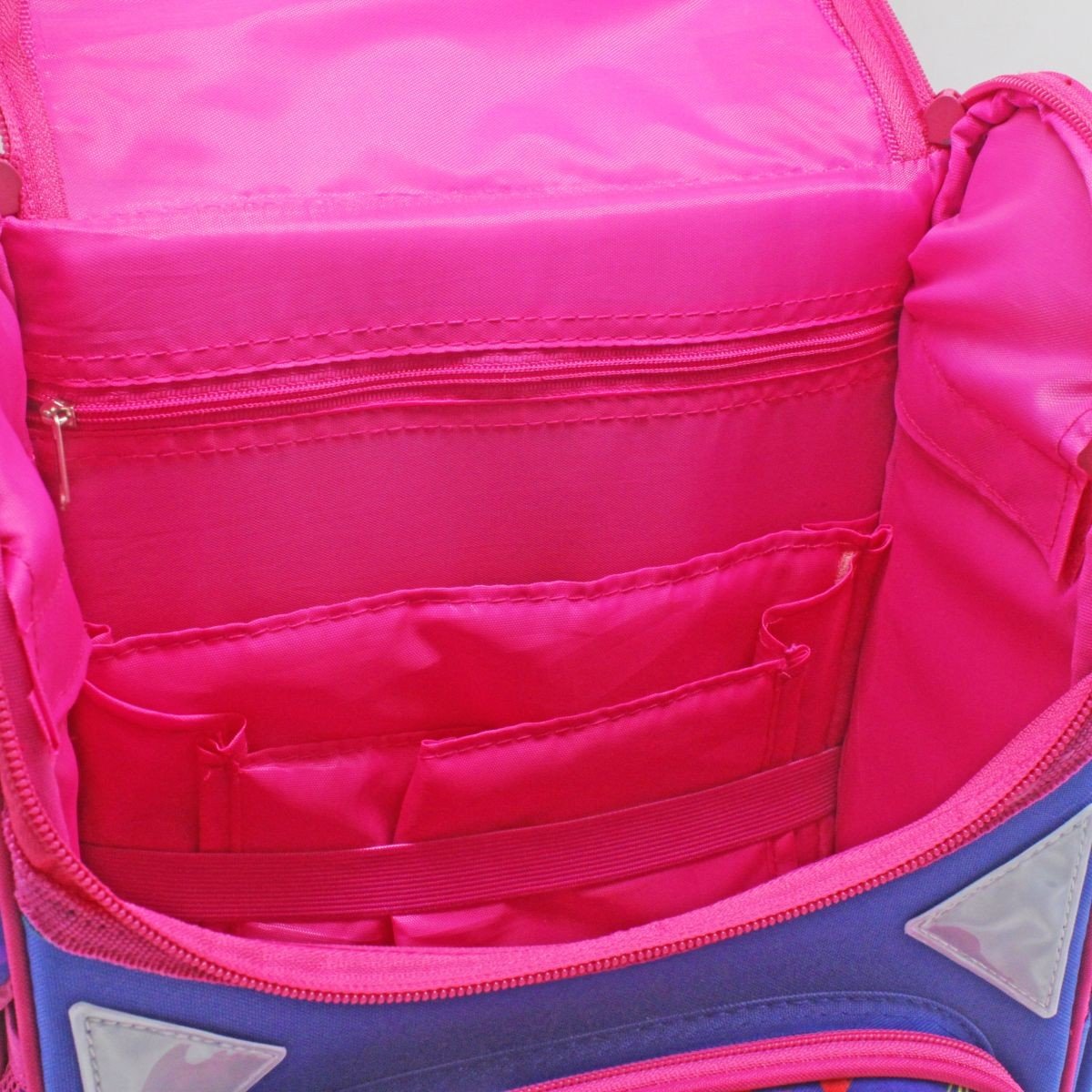 Дитячий рюкзак. Основні характеристики: ортопедична спинка; жорсткий каркас ранця; дві широкі м'які регульовані лямки; внутрішня сторона лямок та спинка з дихаючого матеріалу; ущільнена ручка для перенесення рюкзака; одне містке відділення на блискавці; всередині 1 роздільник та фіксуюча гумка; 2 додаткові кишені: передня кишеня на блискавці на та дві бічні сітчасті кишені; світловідбиваючі елементи на лямках та бічних кишенях. Розмір рюкзака – 33х15х26 см.