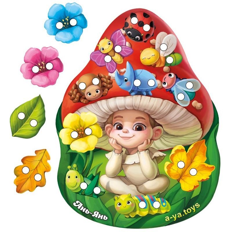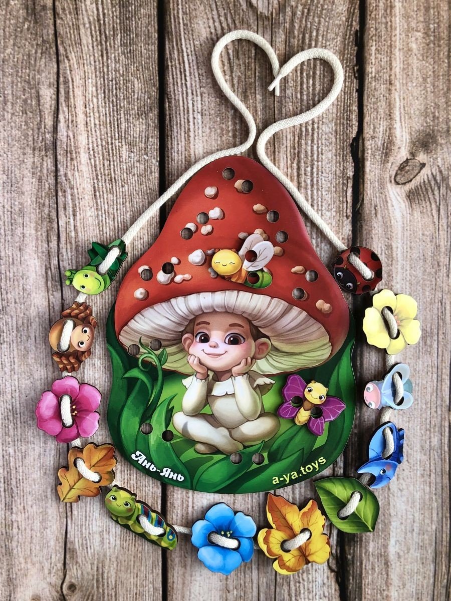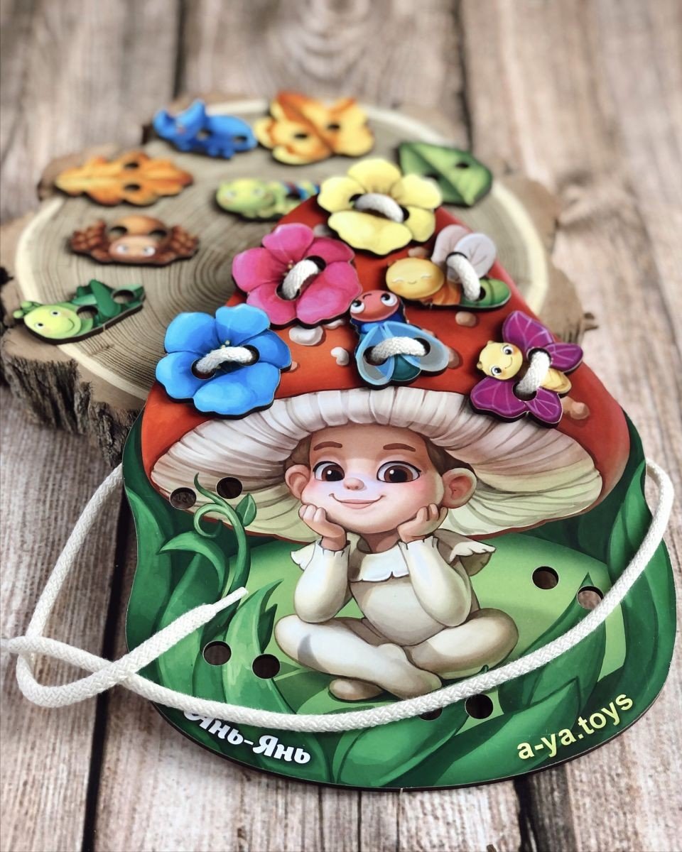 Розвиваюча іграшка із натурального дерева. Шнурівки розвивають дрібну моторику рук, формують навички шнурування, зав'язування шнурка в бант, просторове орієнтування, координацію. Розмір іграшки 25х18,5 см. У комплекті є основа у вигляді милого грибочка, шнурок та 10 деталей для шнурівки.