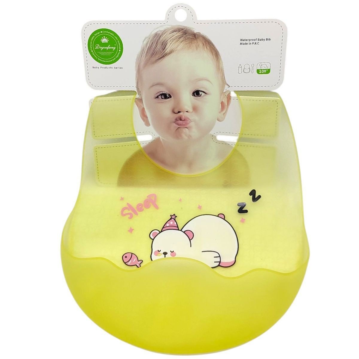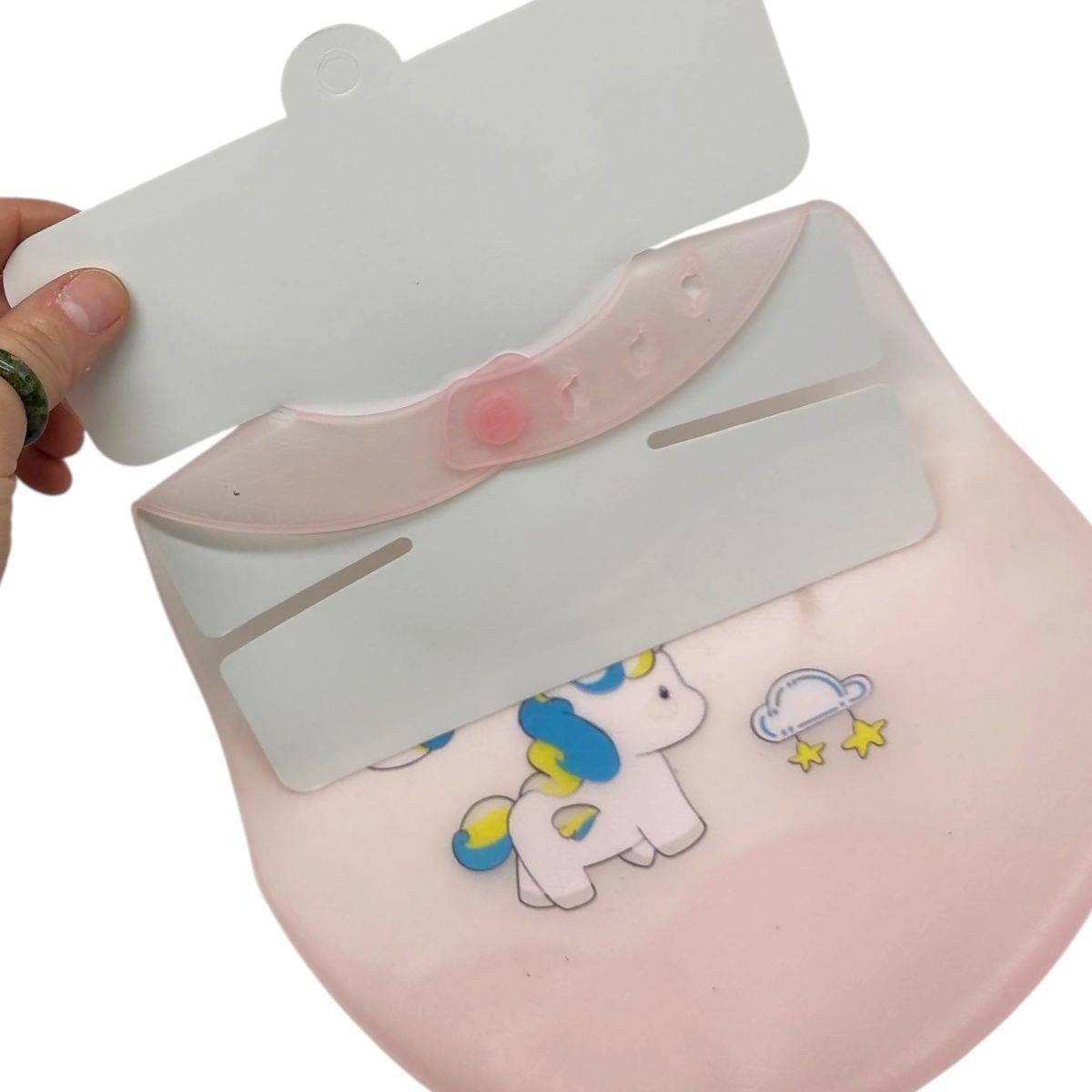 Нагрудник (слюнявчик) з кишенькою для їжі має особливу форму. Розмір коміра регулюється за допомогою ремінця. Силікон — це той матеріал, що не б’ється, не тріскається, не змінює колір. За слюнявчиком легко доглядати, достатньо просто помити під теплою водою з дитячим миючим, Можна дезінфікувати, ставити у посудомийну машину та мікрохвильовку.