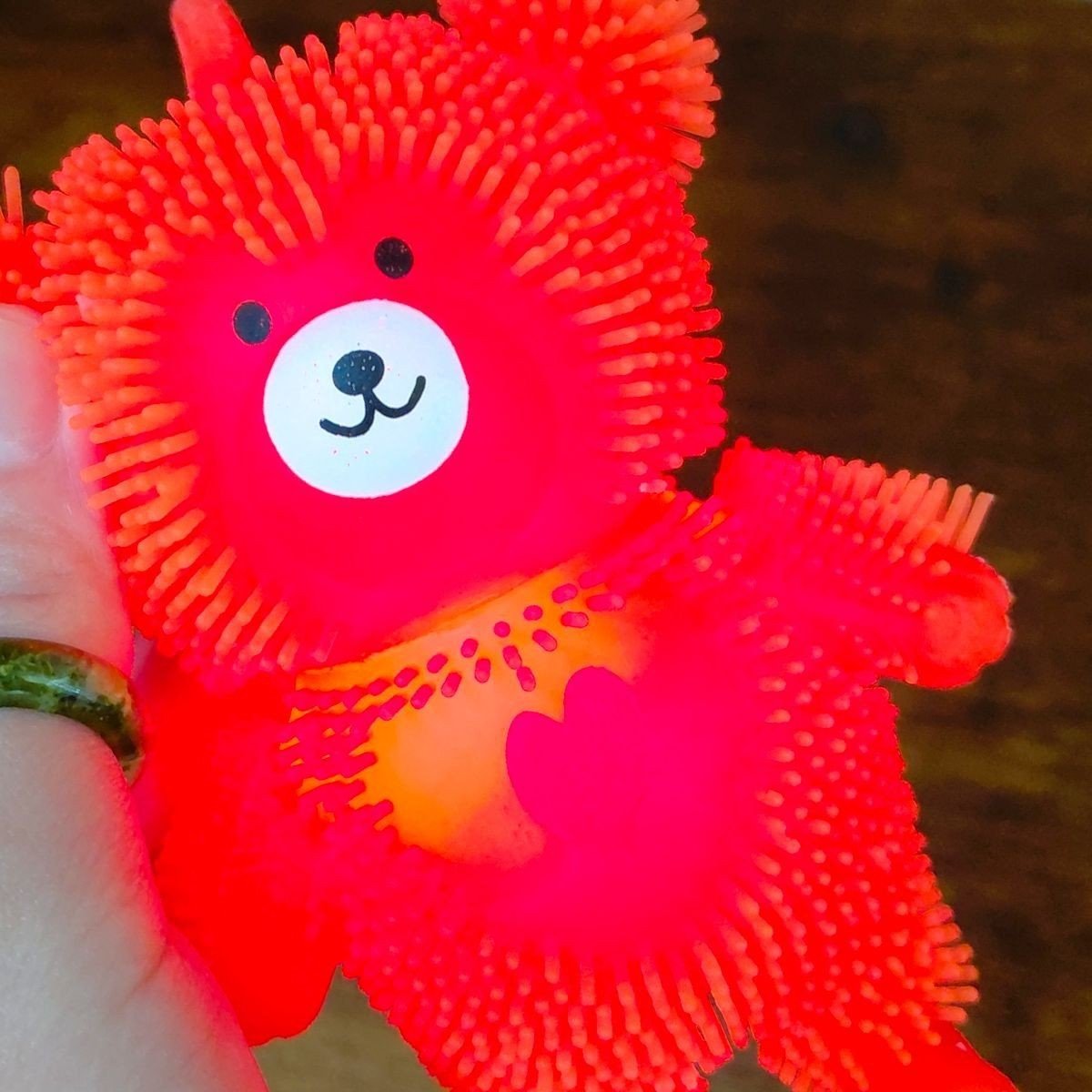 Кумедна світяшка у вигляді ведмедика. Іграшка порожня всередині й наповнена повітрям по типу надувної кулі. Всередині іграшки також є пластикова світяшка, що активується при ударі об поверхню. Виконано з якісних та безпечних матеріалів. Для дітей старше 3-х років. Якщо іграшка трошки здута, можна накачати її за допомогою звичайного медичного шприца з голкою (на іграшці є спеціальний отвір).