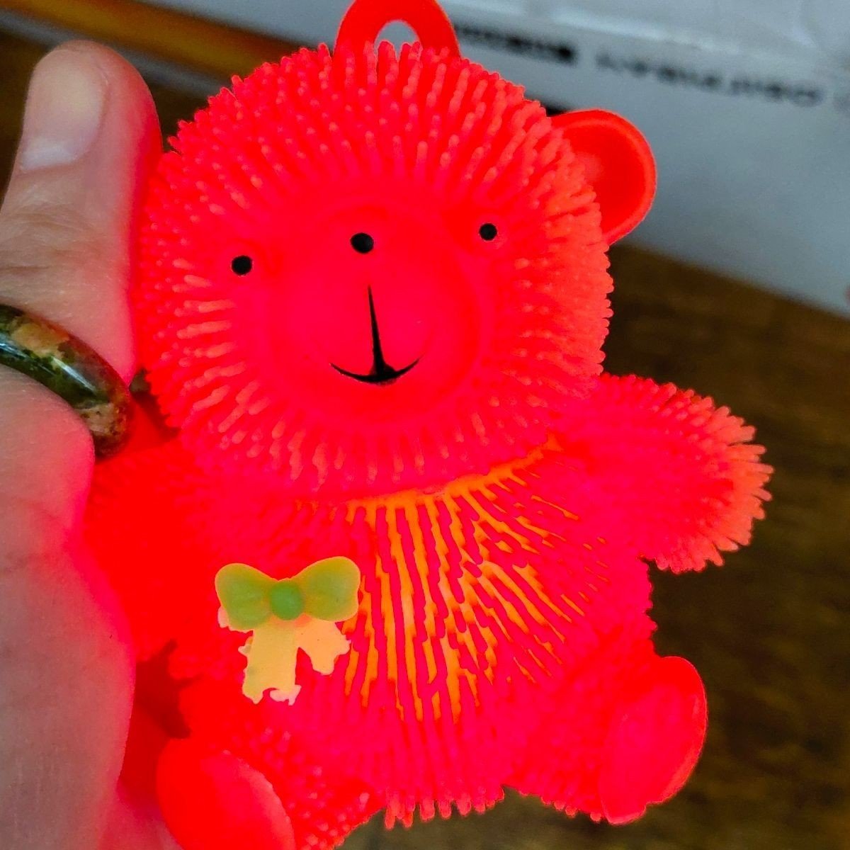 Кумедна світяшка у вигляді ведмедик. Іграшка порожня всередині й наповнена повітрям по типу надувної кулі. Всередині іграшки також є пластикова світяшка, що активується при ударі об поверхню. Виконано з якісних та безпечних матеріалів. Для дітей старше 3-х років. Якщо іграшка трошки здута, можна накачати її за допомогою звичайного медичного шприца з голкою (на іграшці є спеціальний отвір).