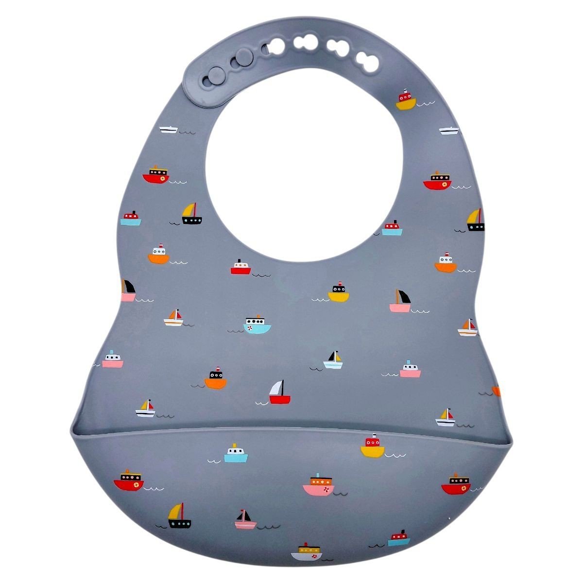 Нагрудник (слюнявчик) з кишенькою для їжі має особливу форму. Розмір коміра регулюється за допомогою ремінця. Силікон — це той матеріал, що не б’ється, не тріскається, не змінює колір. За слюнявчиком легко доглядати, достатньо просто помити під теплою водою з дитячим миючим, Можна дезінфікувати, ставити у посудомийну машину та мікрохвильовку.