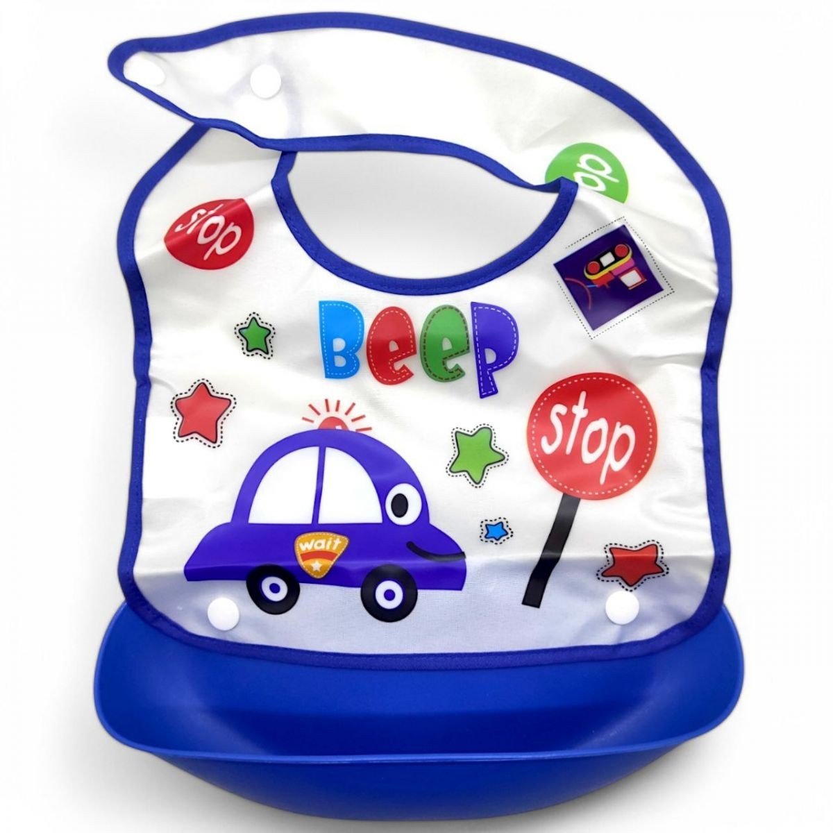 Яскравий слинявчик має особливу форму. Спеціальні кнопки дозволяють пристібати до нагрудника кишеньку для їжі. Розмір комірця регулюється на кнопках. Виготовлений з якісних і безпечних матеріалів.