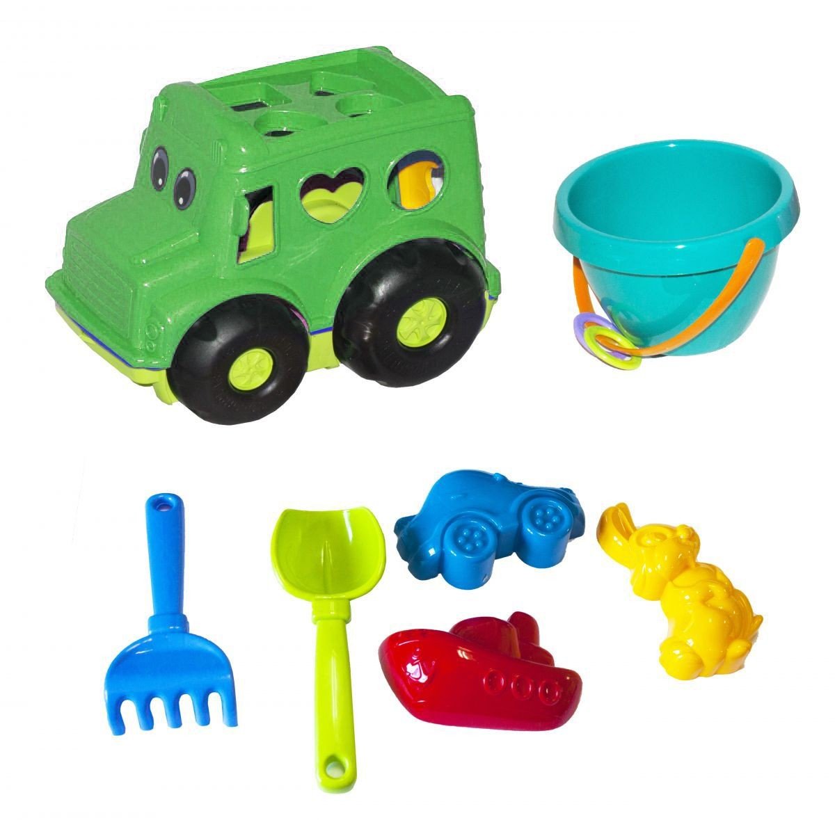 Машинка-сортер "Бусик" з великим піщаним набором. Набір включає в себе: відерце, лопатку, грабельки, три пасочки в формі транспорту або звіряток, фігурки для сортера. З цим набором дитина зможе як грати в піску так і використовувати автобус як сортера, тренуючи уяву, логіку і дрібну моторику.