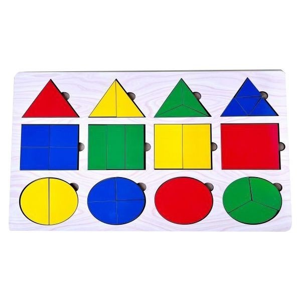 Набір складається з деревʼяної рамки з вирізами та, що відповідають їм, геометричними фігурами. Фігурки складаються з кількох елементів – це допоможе пояснити дитині, що таке половина, третина та чверть. Розвиває дрібну моторику, увагу, логічне мислення та памʼять. Розмір рамки – 22 х 31 см.