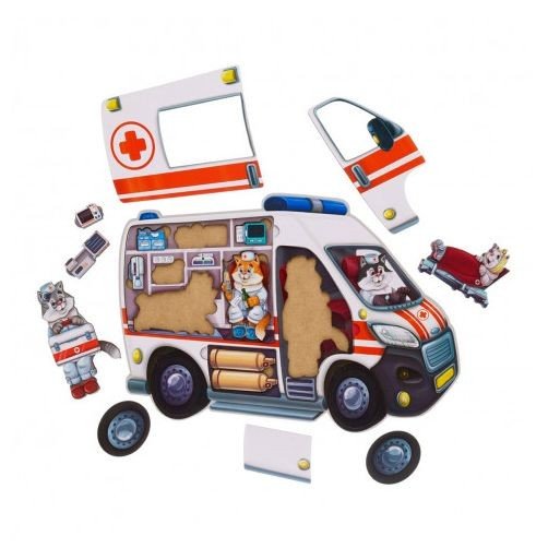Дерев'яна розвиваюча гра сортер. Зроблено у вигляді машини швидкої допомоги зі знімними елементами. Іграшка допоможе у розвитку дрібної моторики, логіки та візуального сприйняття. Розмір 32х23х1, 5 см.