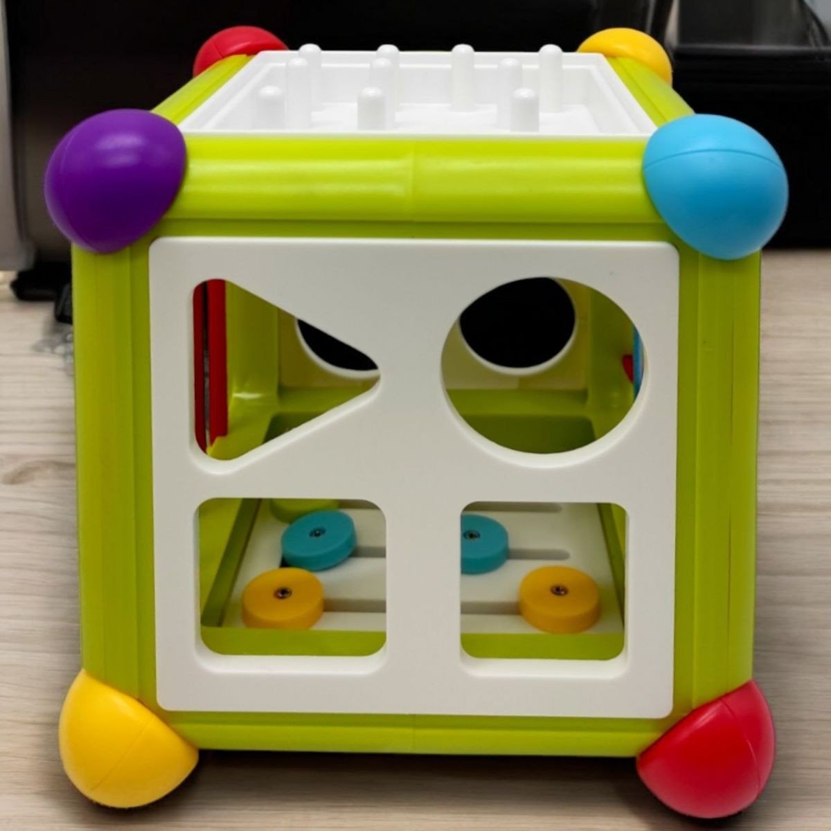 Сортер "Сенсорний куб" - це універсальна іграшка, що розвиває, яка ідеально поєднує в собі елементи сортера і сенсорного розвитку. На гранях куба розташовані: