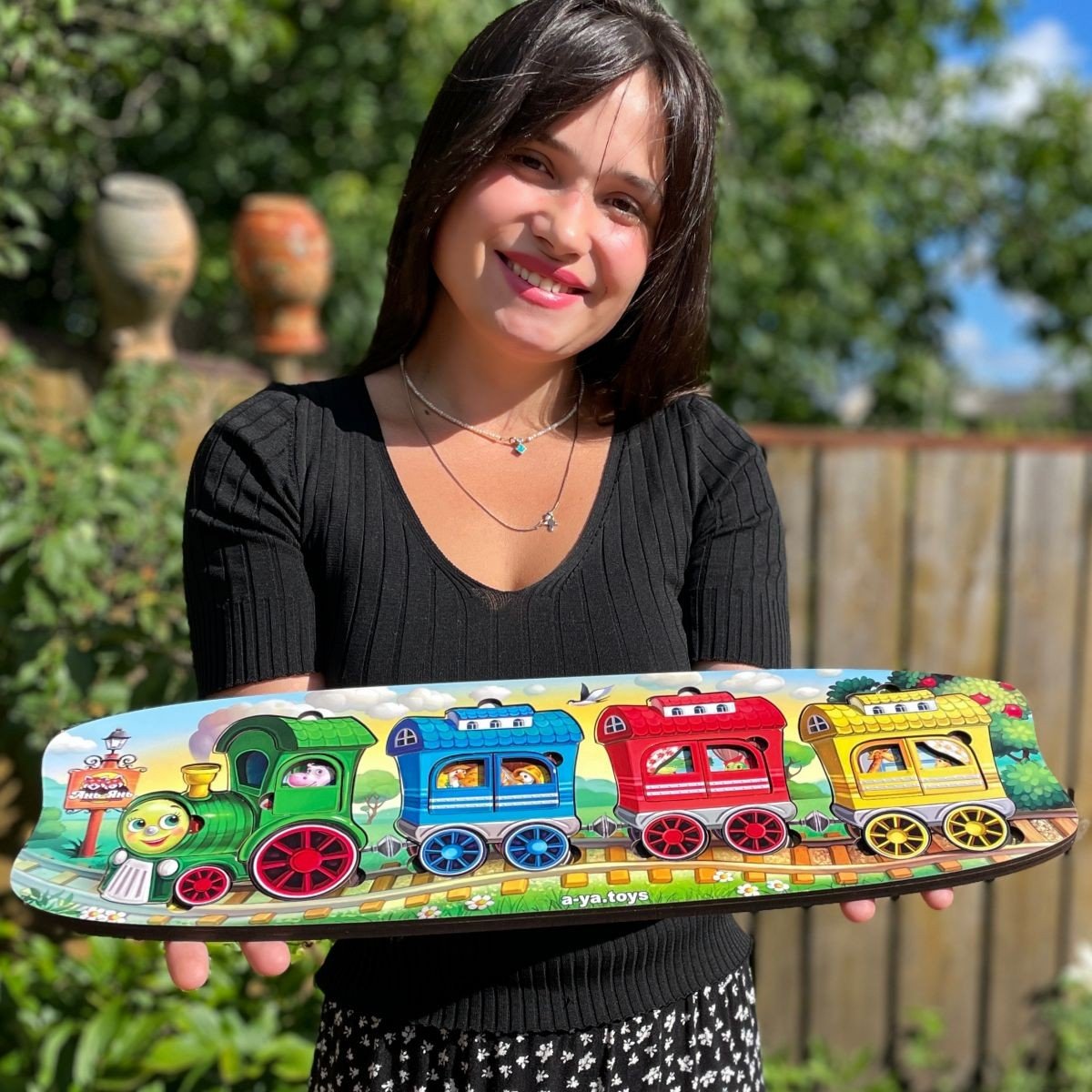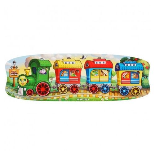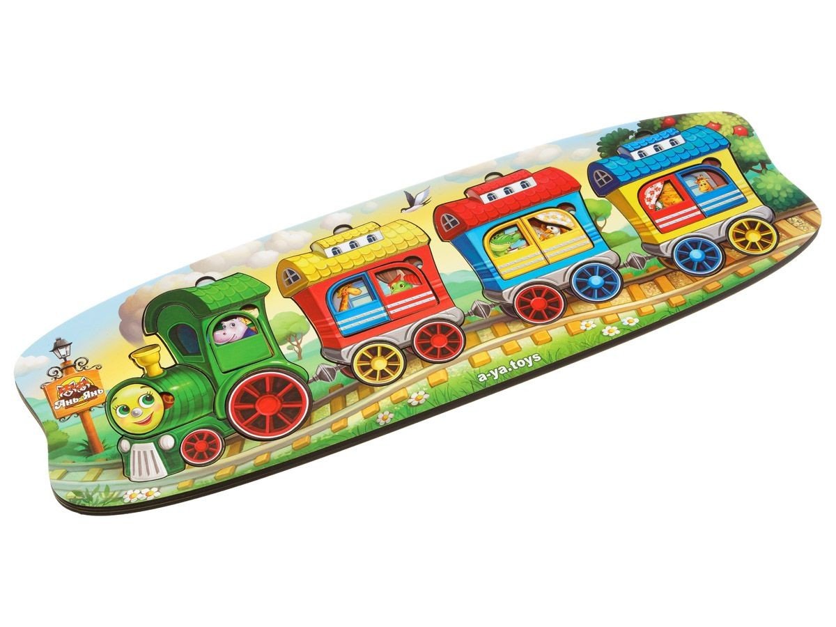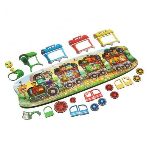 Двошарова гра вкладиш. У нижній шар потрібно помістити тварин, а у верхній – дверцята від вагончиків, у яких вони їдуть. Розмір рамки – 47х16 см.