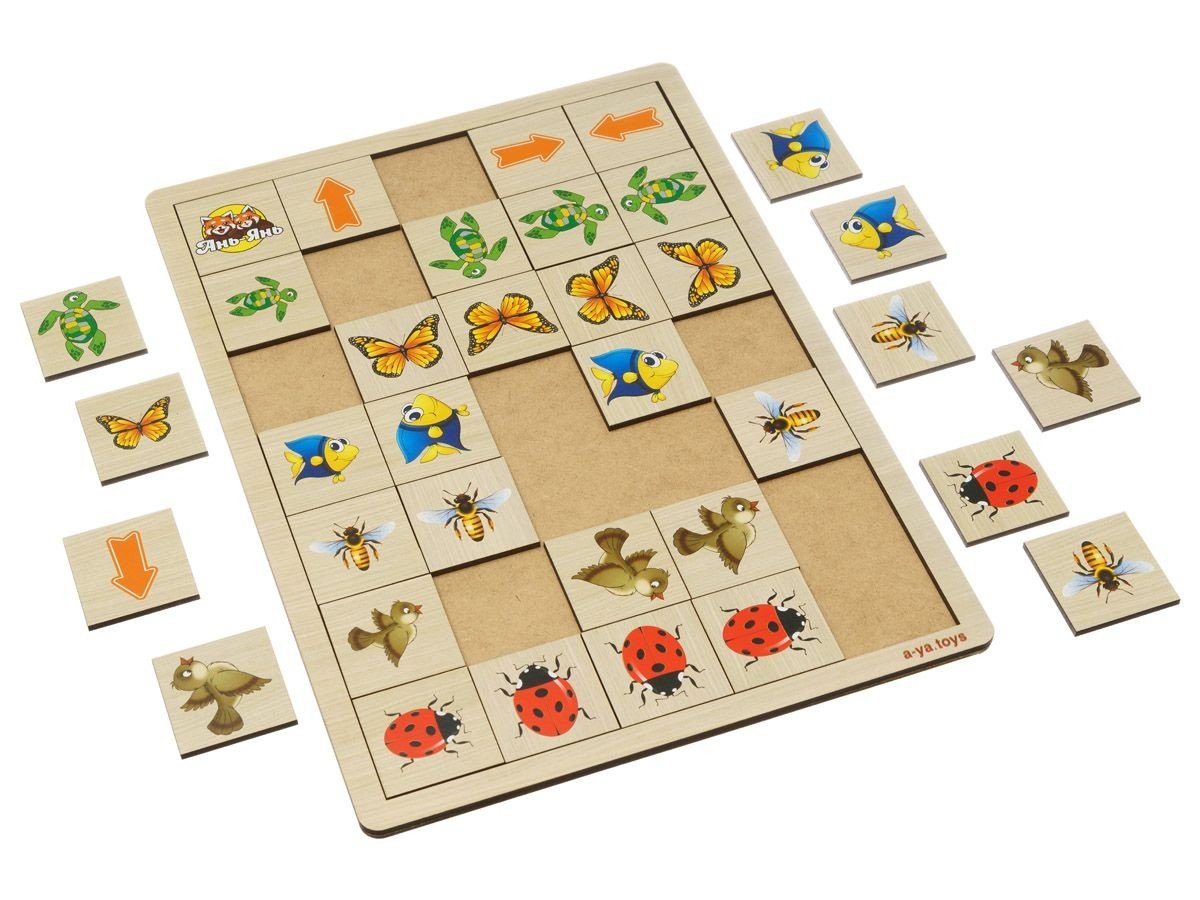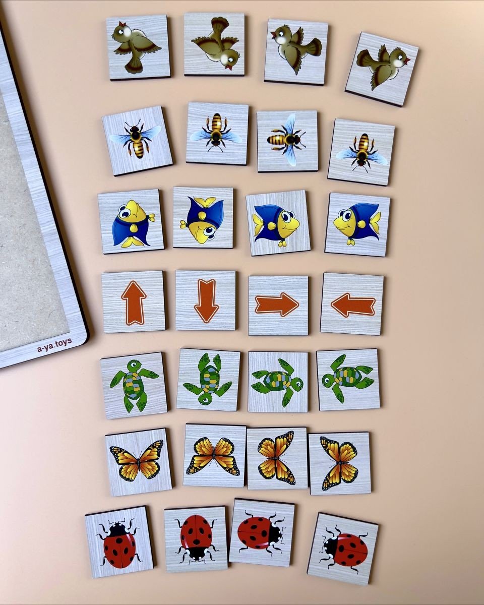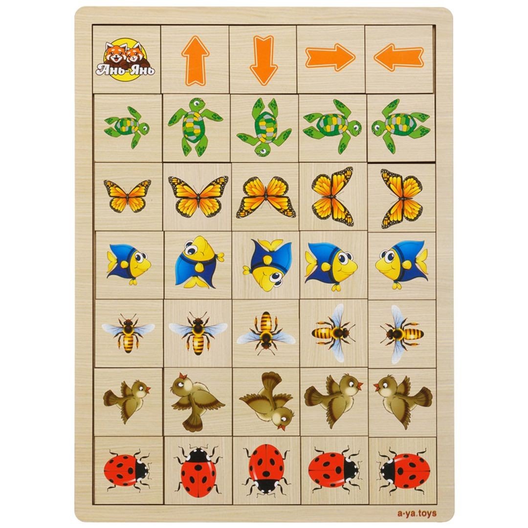 Планшет-основа на якому розміщені: 4 плашки зі схематичними зображеннями предметів, 4 плашки зі стрілочками, 16 плашок для сортування. Дитині необхідно розташувати предмет в потрібній графі в зазначеному положенні (відповідно напрямку стрілок). Наприклад, ось так бджілка летить вгору, а ось так рибка пливе направо. Гра для розвитку навичок орієнтування в просторі (вгору, вниз, вправо, вліво), зорового сприйняття, уваги. Гра виготовлена з дерева. Розмір основи 31,5х23 см.