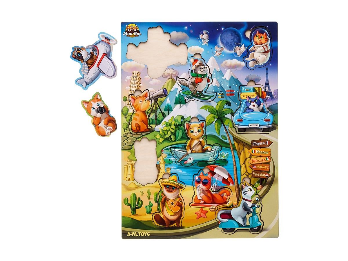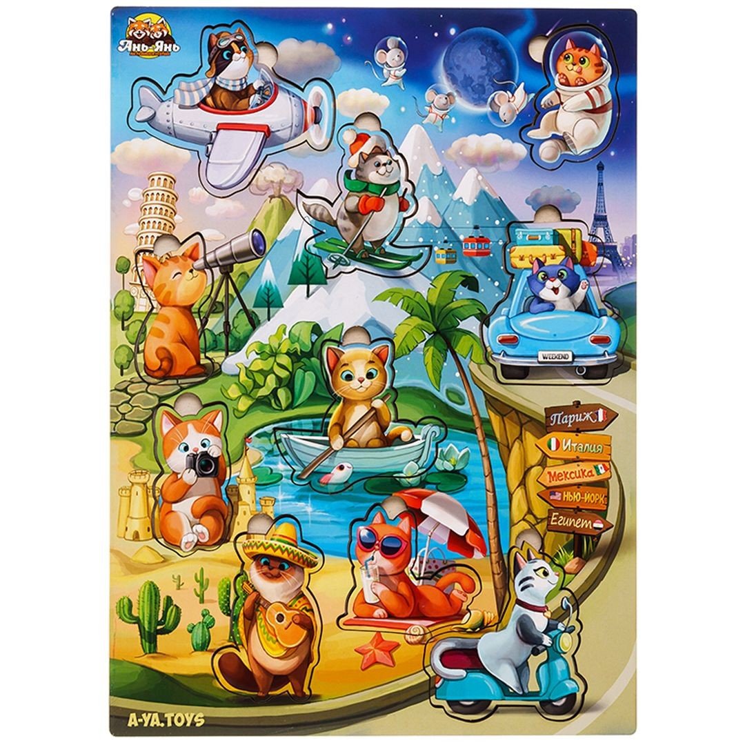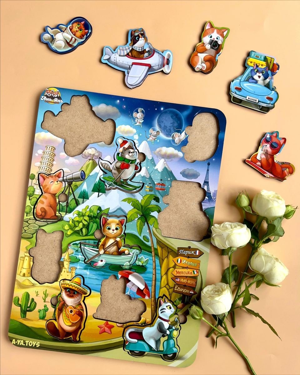 Сортер-вкладиш - яскравий та тематичний фон цього сортера дітям буде розглядати та вивчати у деталях, а 10 милих вкладишів-котиків зручно діставати пальчиками та вкладати на свої місця за формою.