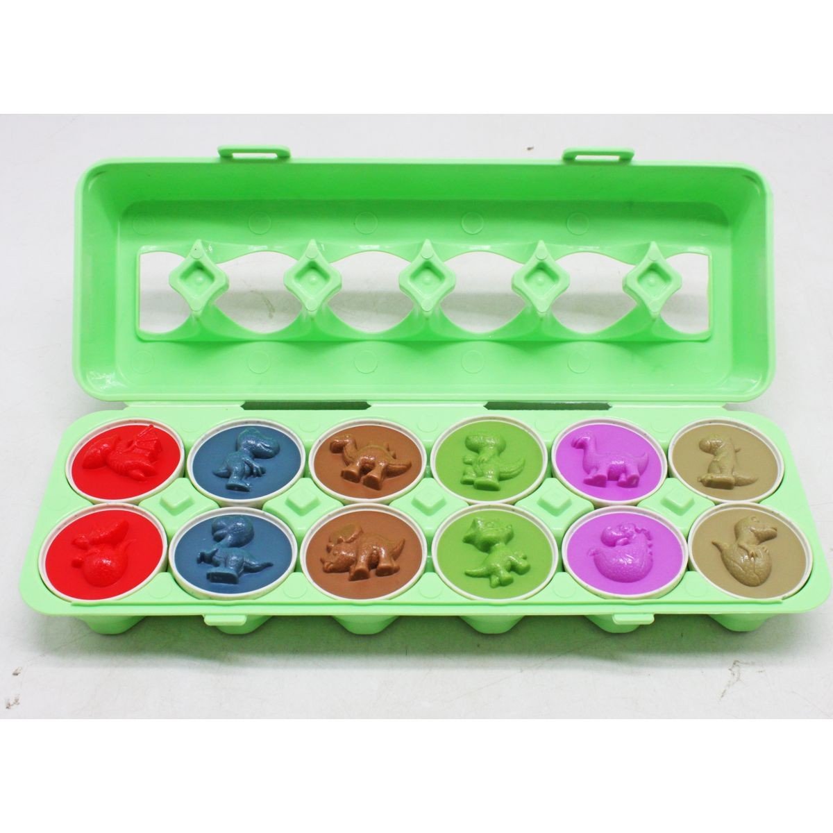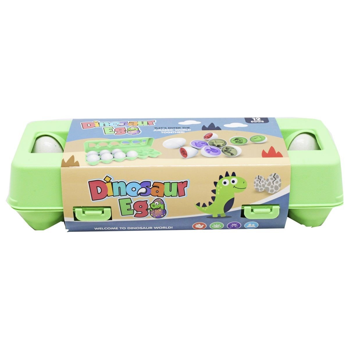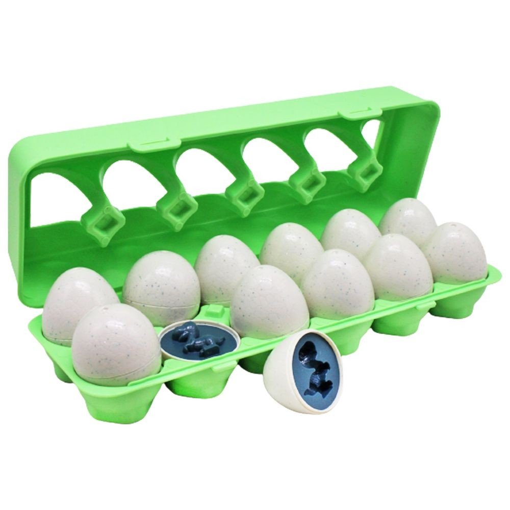 Оригінальна іграшка-сортер у вигляді лотка з 12 яєчками. Кожне яєчко відкривається, усередині можна знайти 3D фігурку у вигляді динозаврика. Щоб закрити яєчко назад, дитині потрібно буде правильно поєднати фігурку з формою, в яку вона міститься. Набір виконаний із міцного пластику. Для дітей віком від 3-х років.