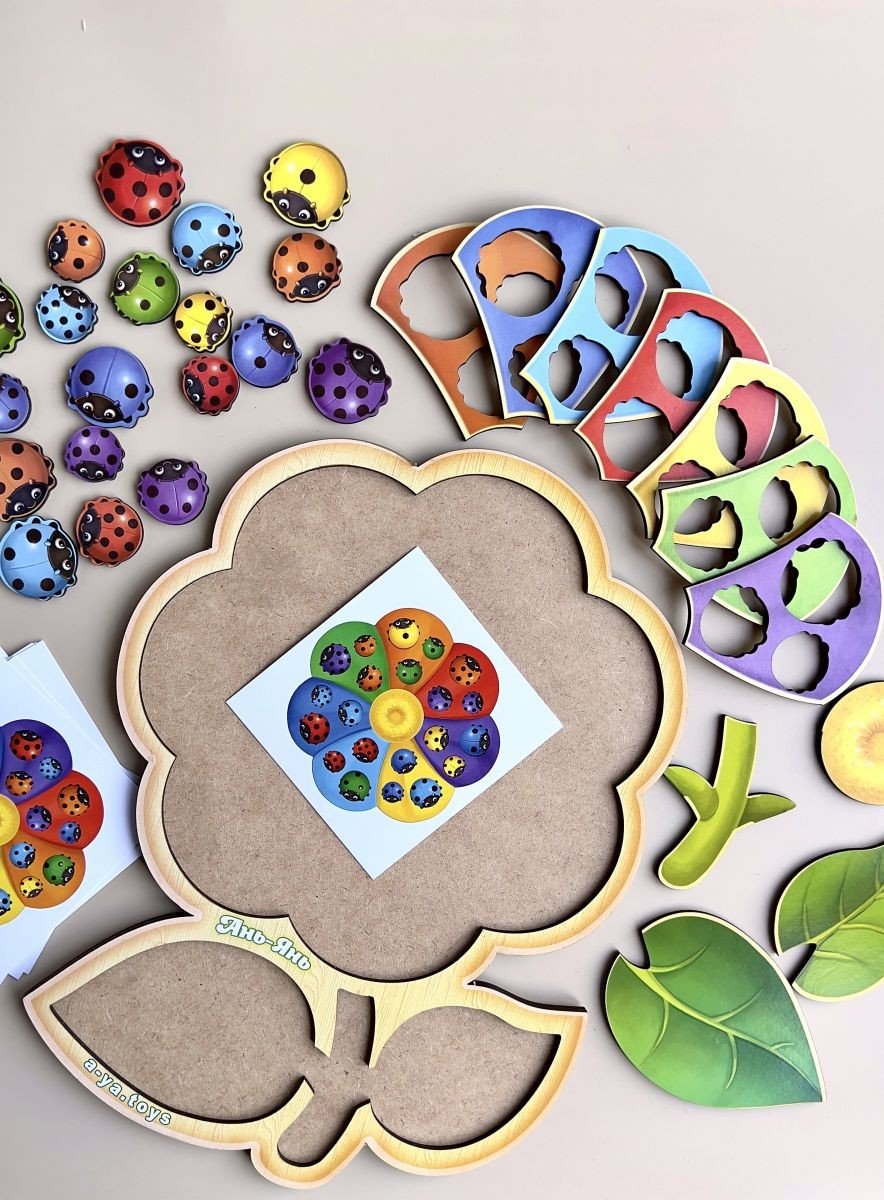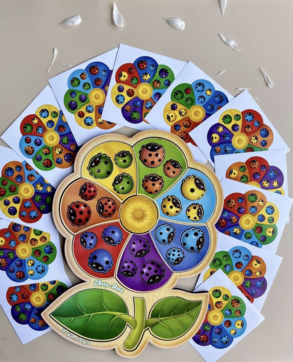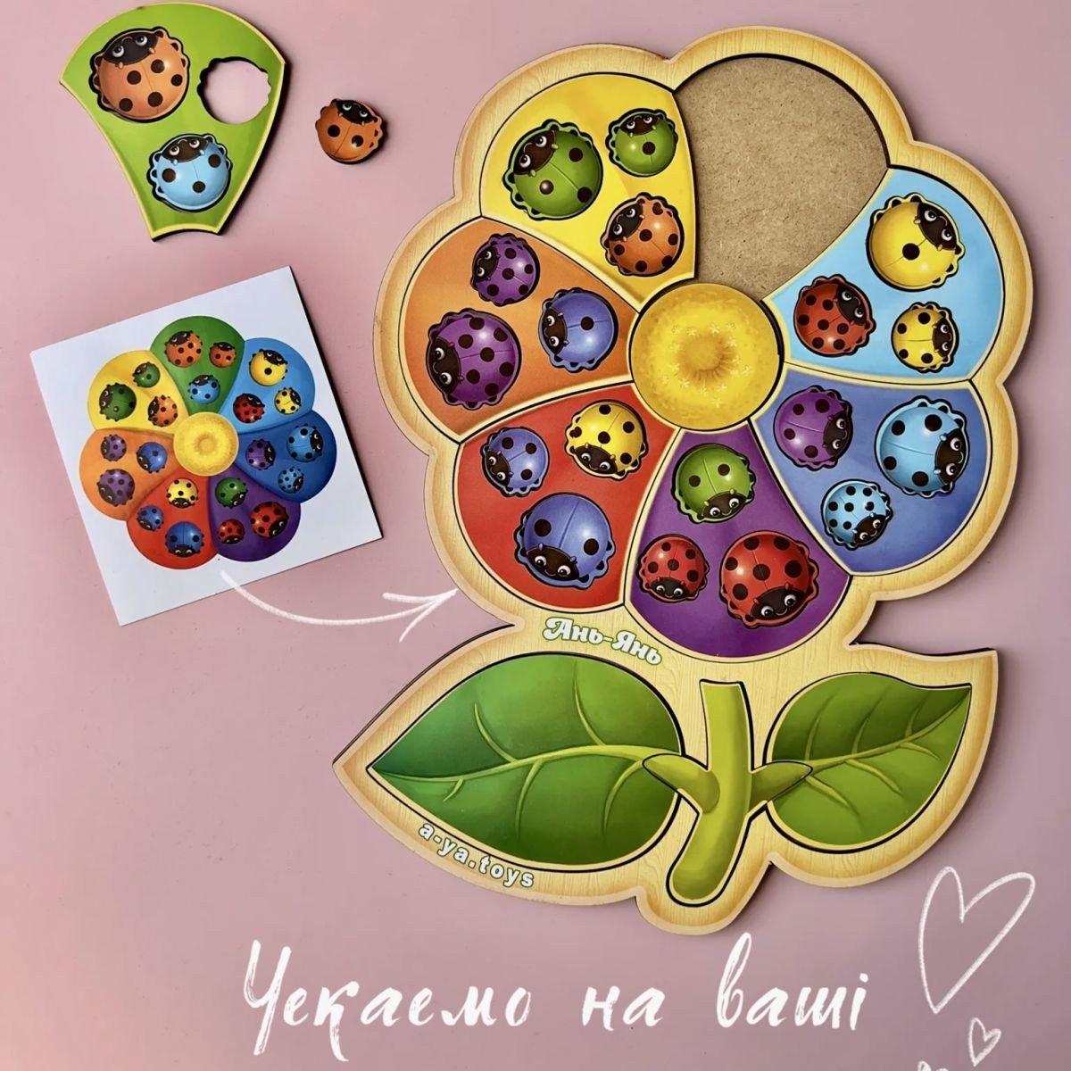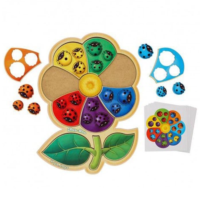 Іграшка сортер зроблена у вигляді квіточки з різнокольоровими пелюстками та сонечками. У наборі є картки із завданнями, за допомогою яких потрібно розмістити всі деталі, як зазначено на малюнку. Допомагає розвивати логіку, уважність та колірне сприйняття. Розмір іграшки 32х23 см.