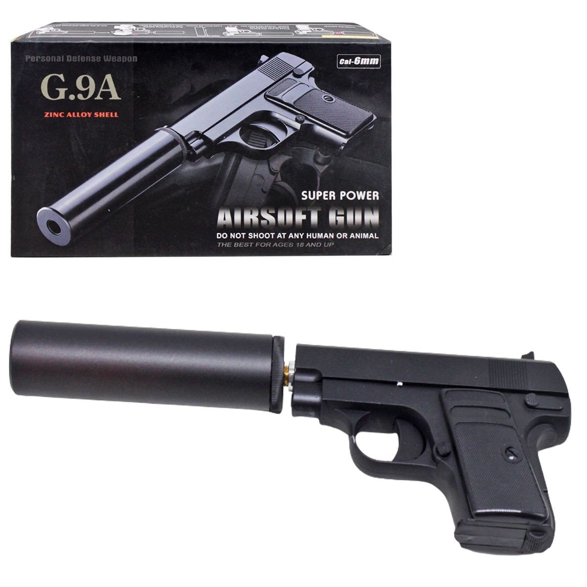Бренд: Zink alloy shell Вік: 18 років Упаковка: Картон Колір: Чорний Вага з упаковкою: 310 г Габарити в упаковці: 21.5 x 13 x 3.5 см Габарити без упаковки: 12 x 8.5 x 2 см Країна виробник: Китай Матеріал: Пластик, метал Комплектація: Пістолет, глушник, кулі.