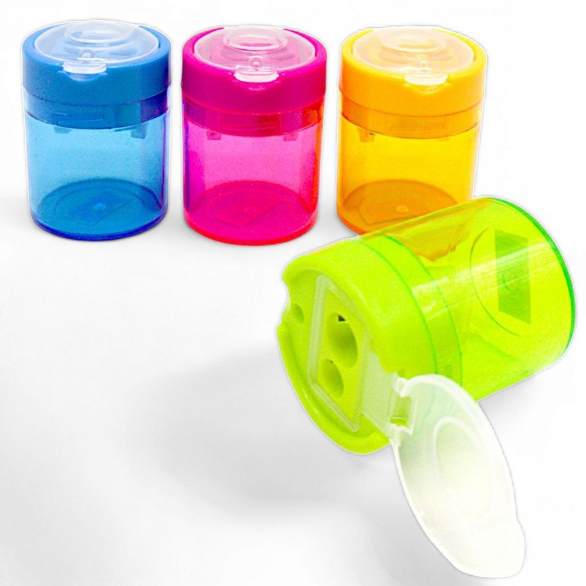 Стругачка з прозорим контейнером - багатофункціональний аксесуар. Контейнер легко відʼєднується від точилки. У стругачки є 2 отвори для олівців (закривається кришкою). Виріб легкий та компактний, добре поміщається в пенал. Розмір - 5,5х4х4 см. Виконано з якісного та міцного пластику. Різні види в асортименті.
