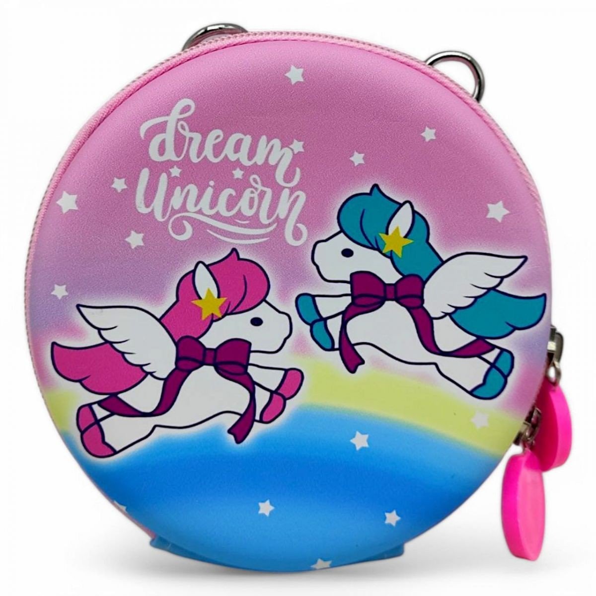 Гарненька сумочка круглої форми буде чудовим подарунком малюку. Має твердий корпус, одне відділення на блискавці. Для зручності перенесення сумочка оснащена регульованим тканинним ремінцем, котрий можна зняти за потреби. Розмір виробу - 13х4,5х13 см. Виготовлено з безпечних та якісних матеріалів.