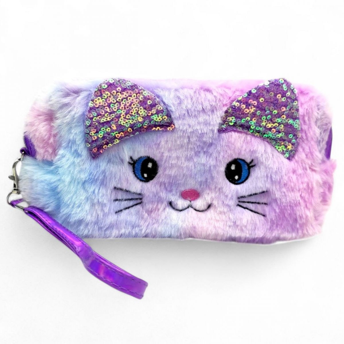 Рожева сумочка-косметичка у вигляді кота. Маленька, але вмістка сумочка, яку зручно брати з собою. Пухнаста, з блискучими вушками. У комплекті є брелок на застібці, який прикрашає сумку. Виготовлена з полімерних матеріалів. Рекомендовано для дітей віком від 3 років.