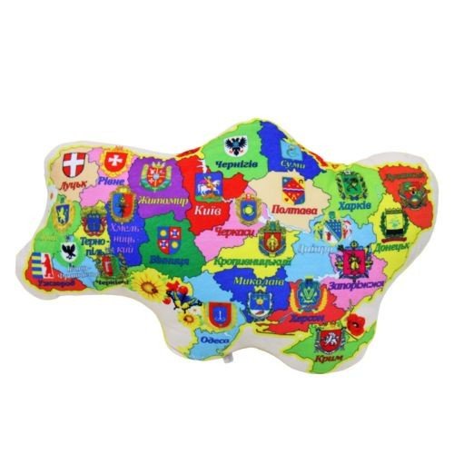 Красива декоративна подушечка у вигляді карти України та зображенням кордонів усіх областей та з гербами. Буде чудовим подарунком та гарною прикрасою інтерєру. Дуже приємна на дотик, мякий синтепоновий наповнювач. Розмір: 42х25х10 см. Виготовлено в Україні.