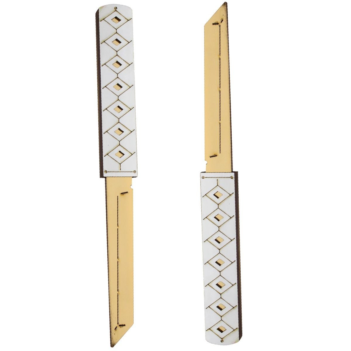 Ножі сувенірі "DOUBLE TANTO". Матеріал: фанера. Довжина ножа – 28 см, ширина ручки – 3 см. Чудовий подарунок-сувенір. Ніж деревʼяний, якісний та міцний. Не заточений, гострі частини закруглені та зашліфовані, повністю безпечний. В золотисто-сріблястому дизайні. Ножі вставляються один в одного. Для дітей віком від 6 років.