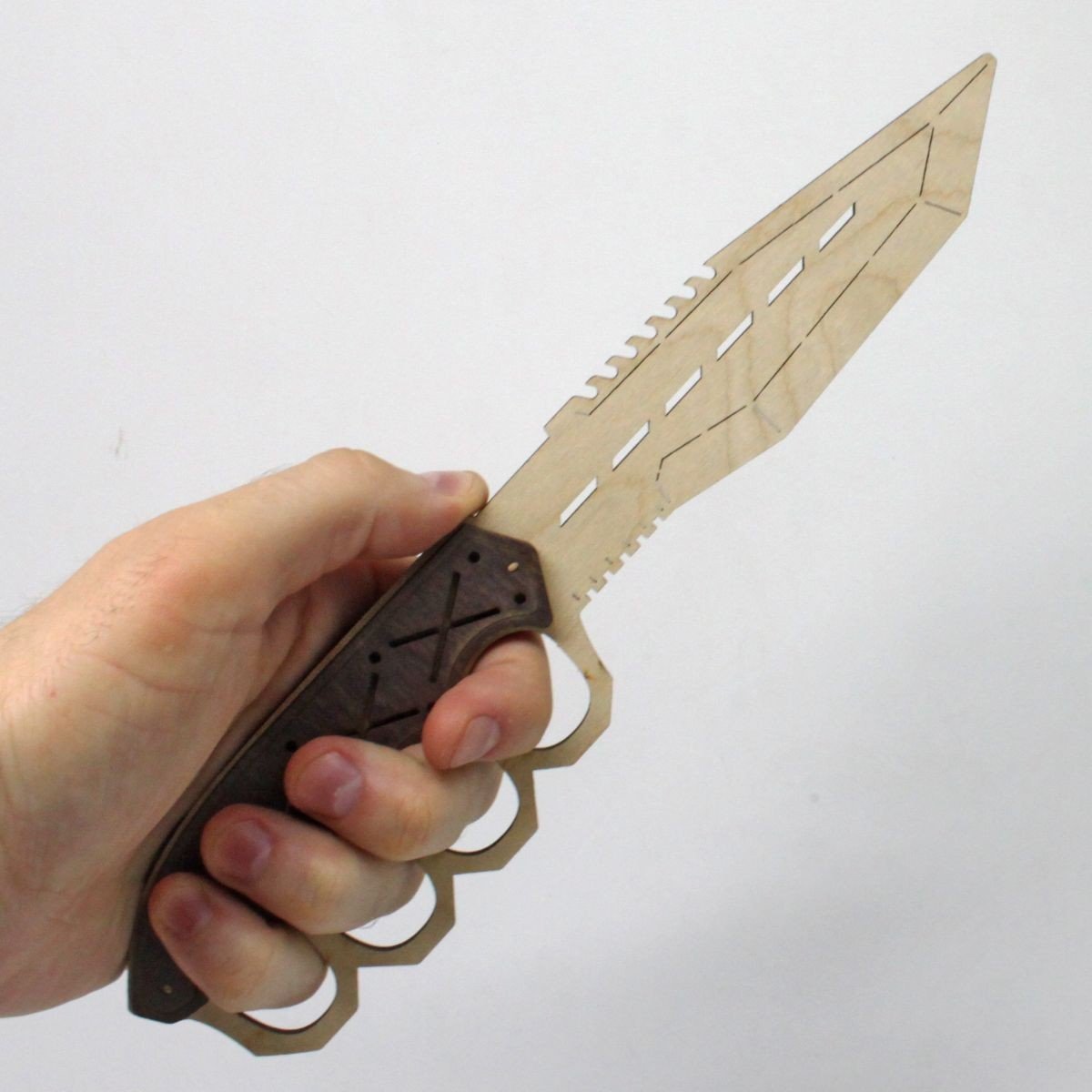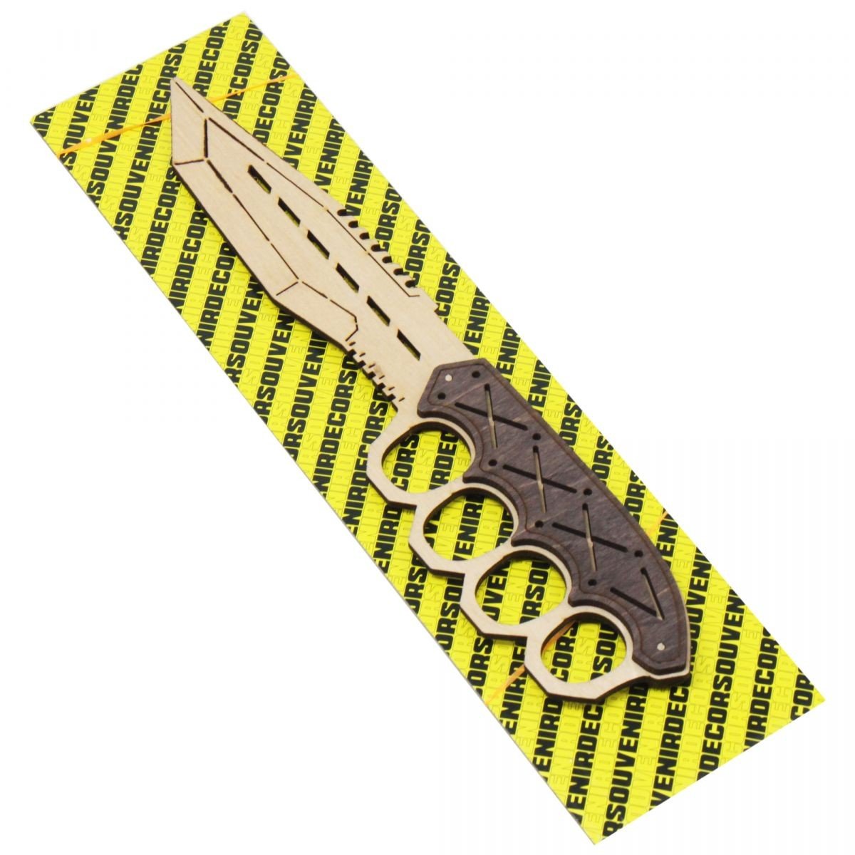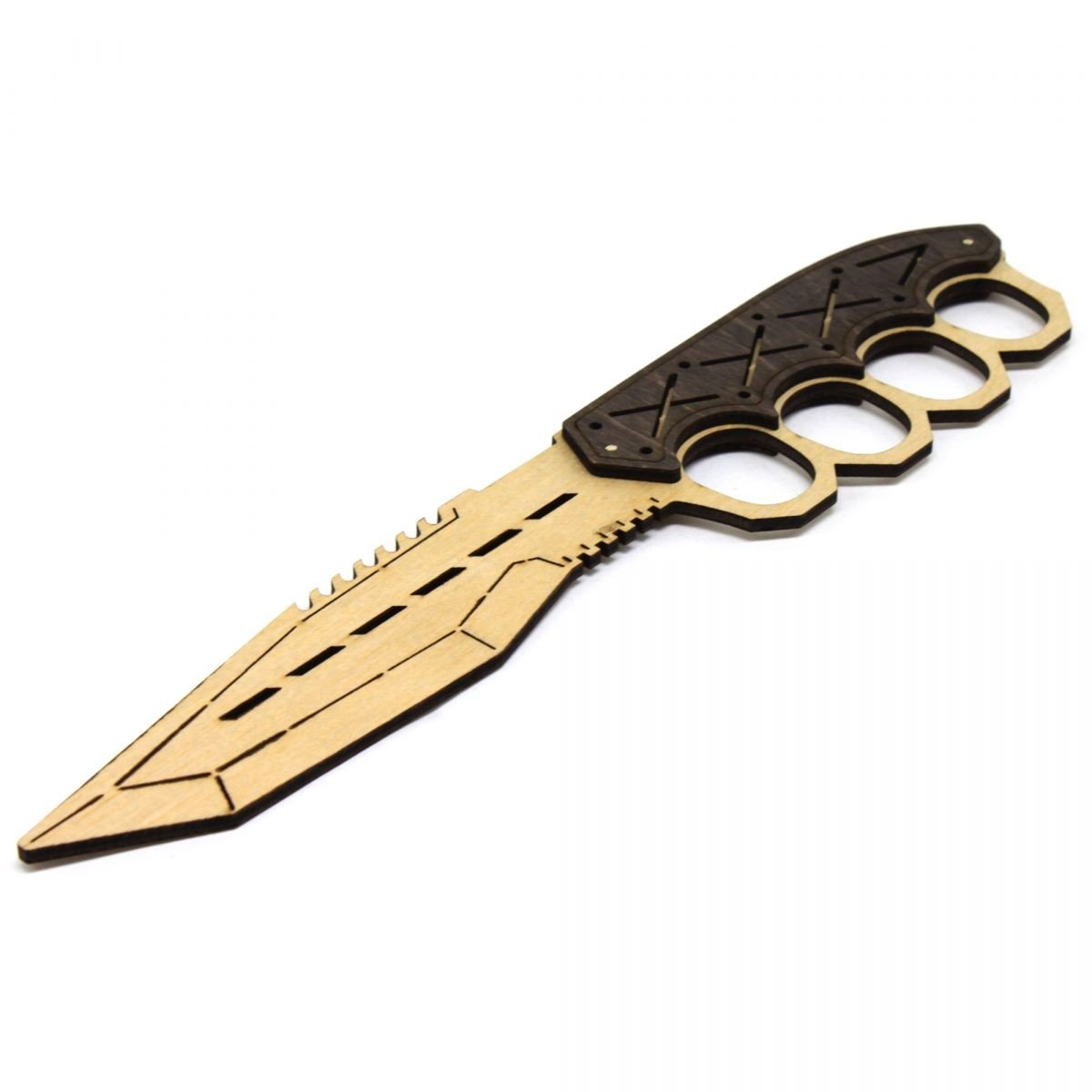 Ніж сувенірний "Кастет". Матеріал: фанера. Довжина ножа – 25 см. Чудовий подарунок-сувенір. Ніж деревʼяний, якісний та міцний. Чи не заточений, гострі частини закруглені та зашліфовані, повністю безпечний. Для дітей віком від 6 років.
